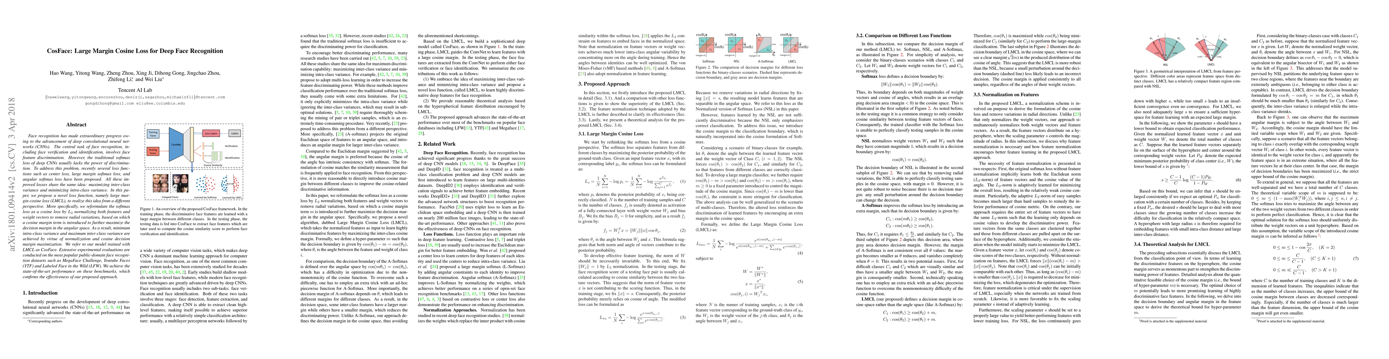 Face recognition has made extraordinary progress owing to the advancement of deep convolutional neural networks (CNNs). The central task of face recognition, including face verification and identification, involves face feature discrimination. However, the traditional softmax loss of deep CNNs usually lacks the power of discrimination. To address this problem, recently several loss functions such as center loss, large margin softmax loss, and angular softmax loss have been proposed. All these improved losses share the same idea: maximizing inter-class variance and minimizing intra-class variance. In this paper, we propose a novel loss function, namely large margin cosine loss (LMCL), to realize this idea from a different perspective. More specifically, we reformulate the softmax loss as a cosine loss by $L_2$ normalizing both features and weight vectors to remove radial variations, based on which a cosine margin term is introduced to further maximize the decision margin in the angular space. As a result, minimum intra-class variance and maximum inter-class variance are achieved by virtue of normalization and cosine decision margin maximization. We refer to our model trained with LMCL as CosFace. Extensive experimental evaluations are conducted on the most popular public-domain face recognition datasets such as MegaFace Challenge, Youtube Faces (YTF) and Labeled Face in the Wild (LFW). We achieve the state-of-the-art performance on these benchmarks, which confirms the effectiveness of our proposed approach.