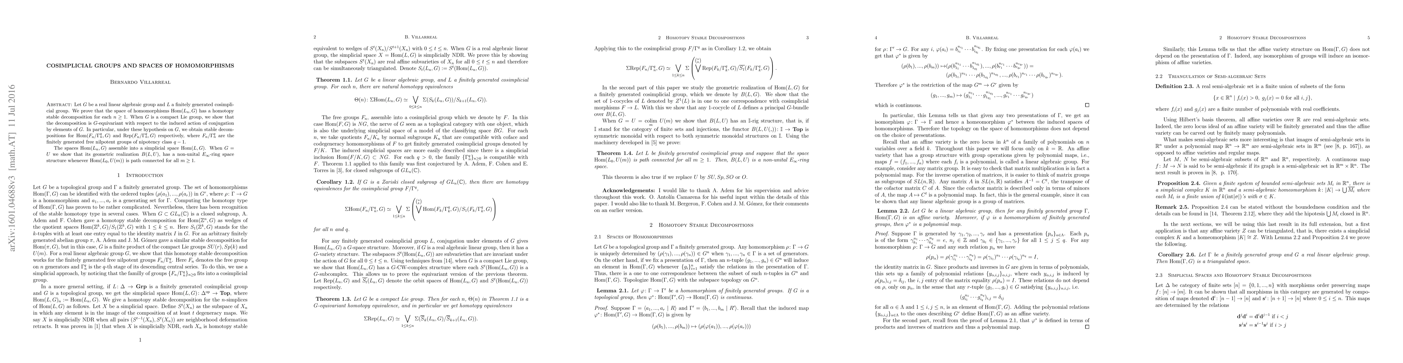 Let $G$ be a real linear algebraic group and $L$ a finitely generated cosimplicial group. We prove that the space of homomorphisms $Hom(L_n,G)$ has a homotopy stable decomposition for each $n\geq 1$. When $G$ is a compact Lie group, we show that the decomposition is $G$-equivariant with respect to the induced action of conjugation by elements of $G$. The spaces $Hom(L_n,G)$ assemble into a simplicial space $Hom(L,G)$. When $G=U$ we show that its geometric realization $B(L,U)$, has a non-unital $E_\infty$-ring space structure whenever $Hom(L_0,U(m))$ is path connected for all $m\geq1$.
