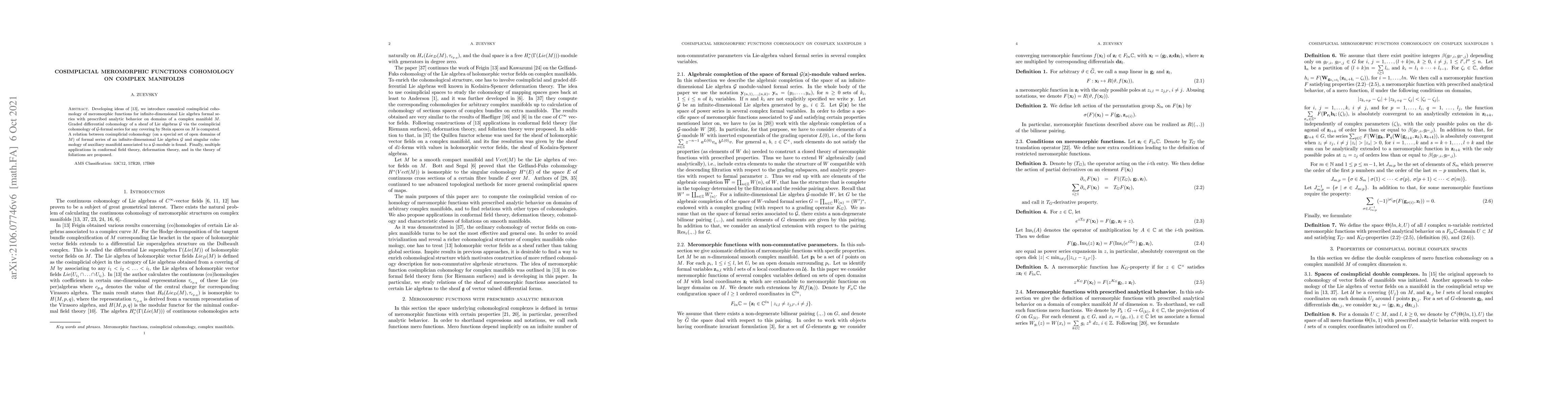 This paper introduces a new cosimplicial cohomology for meromorphic functions on complex manifolds, extending Fei's ideas, and computes its relation to singular cohomology of associated manifolds. Applications to conformal field theory, deformation theory, and foliation theory are proposed.