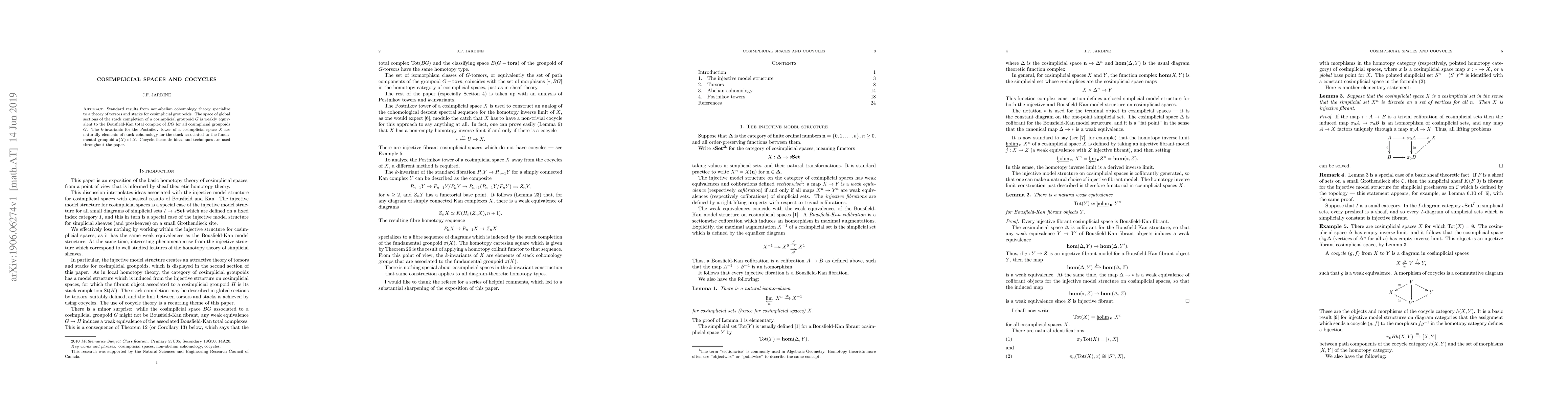 Standard results from non-abelian cohomology theory specialize to a theory of torsors and stacks for cosimplicial groupoids. The space of global sections of the stack completion of a cosimplicial groupoid $G$ is weakly equivalent to the Bousfield-Kan total complex of $BG$ for all cosimplicial groupoids $G$. The $k$-invariants for the Postnikov tower of a cosimplicial space $X$ are naturally elements of stack cohomology for the stack associated to the fundamental groupoid $\pi(X)$ of $X$. Cocycle-theoretic ideas and techniques are used throughout the paper.
