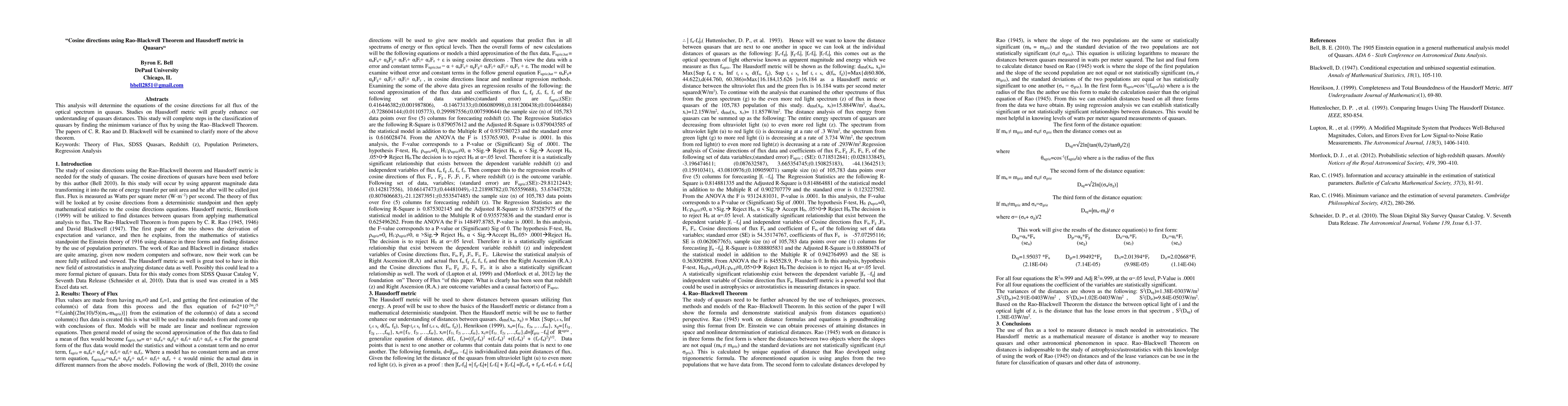 This analysis will determine the equations of the cosine directions for all flux of the optical spectrum in quasars. Studies on Hausdorff metric will greatly enhance our understanding of quasars distances. This study will complete steps in the classification of quasars by finding the minimum variance of flux by using the RaoBlackwell Theorem. The papers of C. R. Rao and D. Blackwell will be examined to clarify more of the above theorem. Keywords: Theory of Flux, SDSS, Quasars, Redshift (z), Population Perimeters, Regression Analysis
