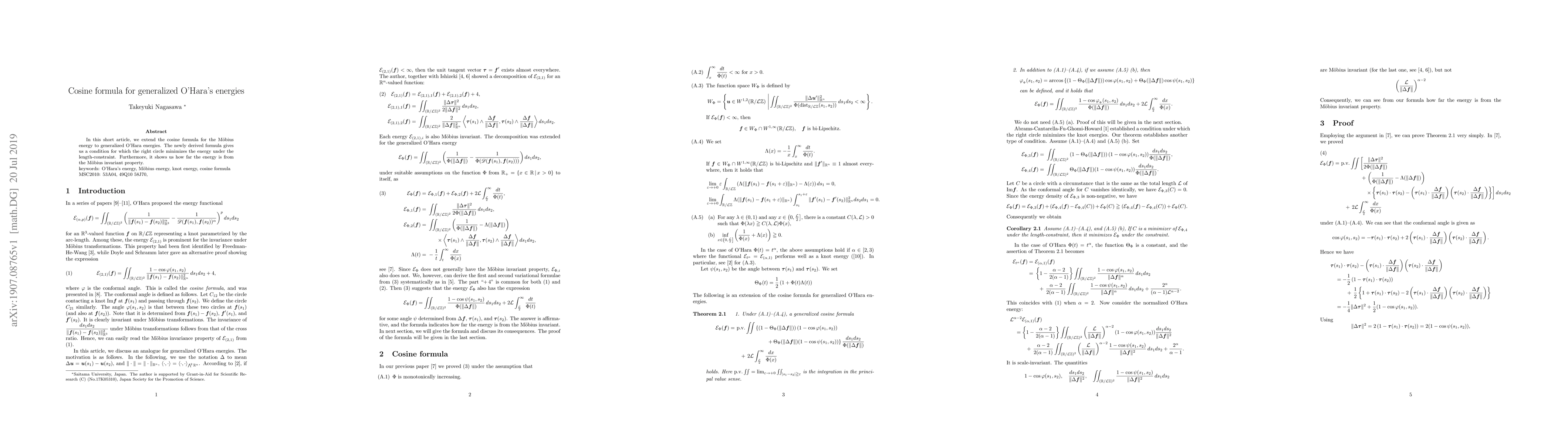 In this short article, we extend the cosine formula for the M\"{o}bius energy to generalized O'Hara energies. The newly derived formula gives us a condition for which the right circle minimizes the energy under the length-constraint. Furthermore, it shows us how far the energy is from the M\"{o}bius invariant property.