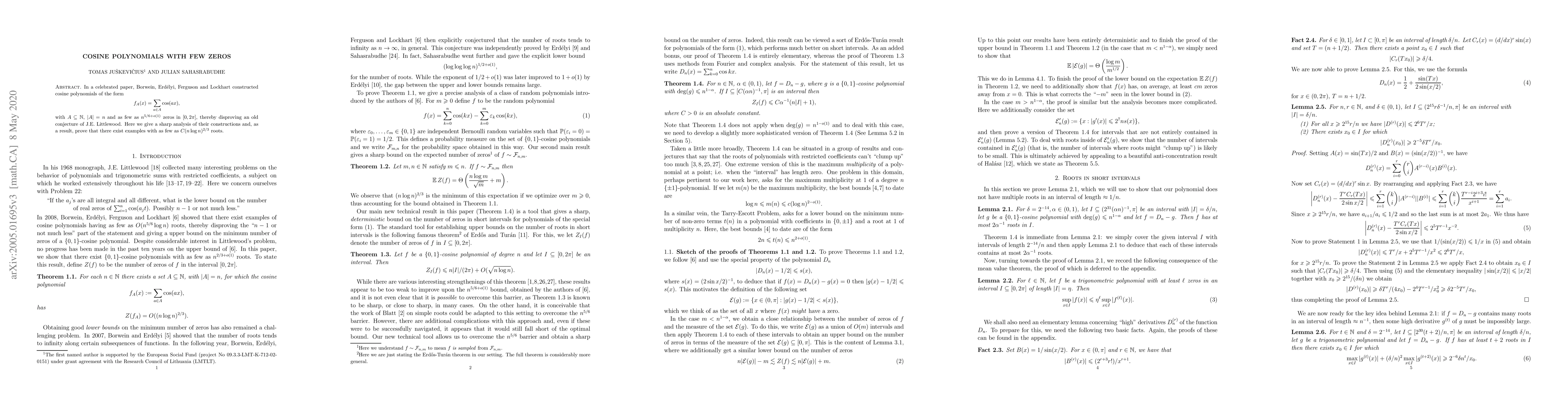 In a celebrated paper, Borwein, Erd\'elyi, Ferguson and Lockhart constructed cosine polynomials of the form \[ f_A(x) = \sum_{a \in A} \cos(ax), \] with $A\subseteq \mathbb{N}$, $|A|= n$ and as few as $n^{5/6+o(1)}$ zeros in $[0,2\pi]$, thereby disproving an old conjecture of J.E. Littlewood. Here we give a sharp analysis of their constructions and, as a result, prove that there exist examples with as few as $C(n\log n)^{2/3}$ roots.