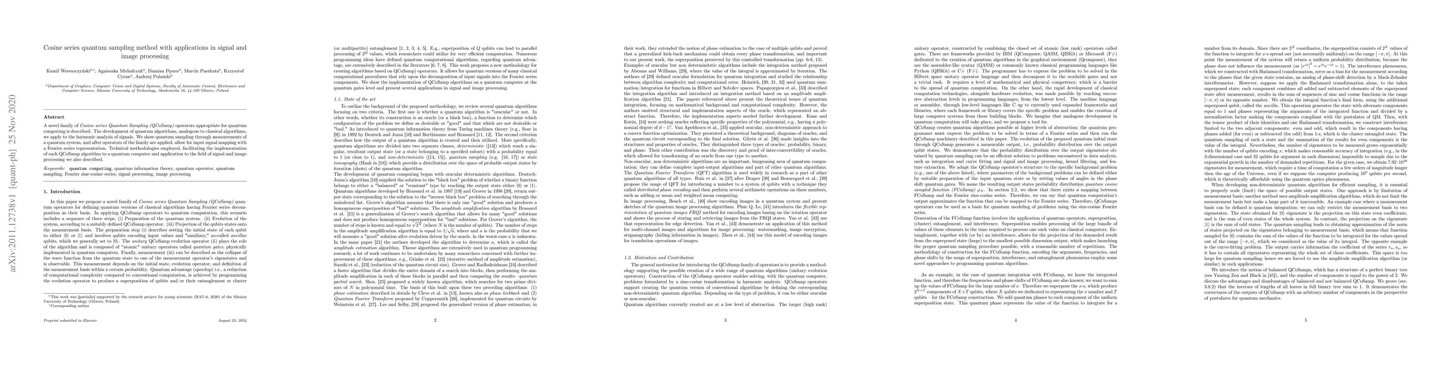 A novel family of Cosine series Quantum Sampling (QCoSamp) operators appropriate for quantum computing is described. The development of quantum algorithms, analogous to classical algorithms, we apply to the harmonic analysis of signals. We show quantum sampling through measurements of a quantum system, and after operators of the family are applied, allow for input signal mapping with a Fourier series representation. Technical methodologies employed, facilitating the implementation of each QCoSamp algorithm to a quantum computer and application to the field of signal and image processing we also described. Keywords: quantum computing, quantum information theory, quantum operator, quantum sampling, Fourier sine-cosine series, signal processing, image processing