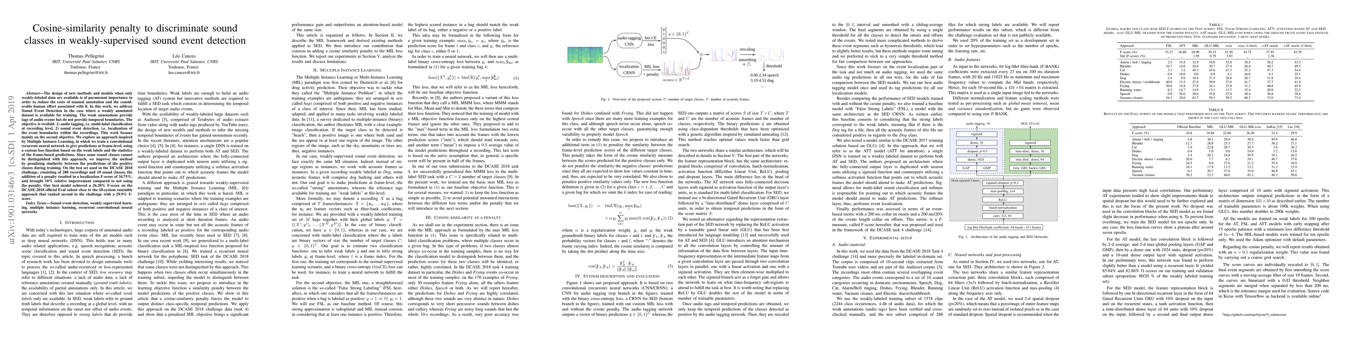 This paper proposes a novel method for weakly-supervised sound event detection using a convolutional recurrent neural network with a cosine-similarity penalty to improve class discrimination. The approach achieved a 10% relative improvement in localization F-score on the DCASE 2018 test set, reaching a 26.20% F-score, nearly matching the second-ranked ensemble model.