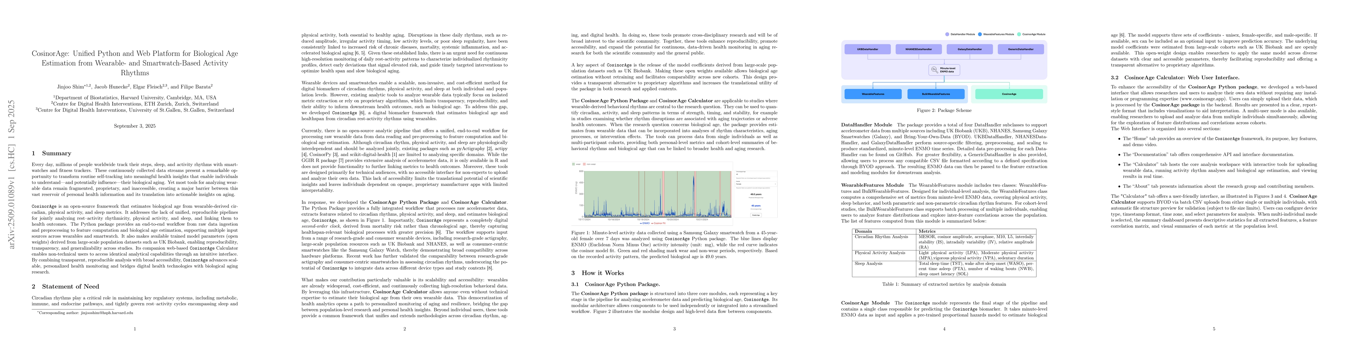 Every day, millions of people worldwide track their steps, sleep, and activity rhythms with smartwatches and fitness trackers. These continuously collected data streams present a remarkable opportunity to transform routine self-tracking into meaningful health insights that enable individuals to understand -- and potentially influence -- their biological aging. Yet most tools for analyzing wearable data remain fragmented, proprietary, and inaccessible, creating a major barrier between this vast reservoir of personal health information and its translation into actionable insights on aging. CosinorAge is an open-source framework that estimates biological age from wearable-derived circadian, physical activity, and sleep metrics. It addresses the lack of unified, reproducible pipelines for jointly analyzing rest-activity rhythmicity, physical activity, and sleep, and linking them to health outcomes. The Python package provides an end-to-end workflow from raw data ingestion and preprocessing to feature computation and biological age estimation, supporting multiple input sources across wearables and smartwatch. It also makes available trained model parameters (open weights) derived from large-scale population datasets such as UK Biobank, enabling reproducibility, transparency, and generalizability across studies. Its companion web-based CosinorAge Calculator enables non-technical users to access identical analytical capabilities through an intuitive interface. By combining transparent, reproducible analysis with broad accessibility, CosinorAge advances scalable, personalized health monitoring and bridges digital health technologies with biological aging research.