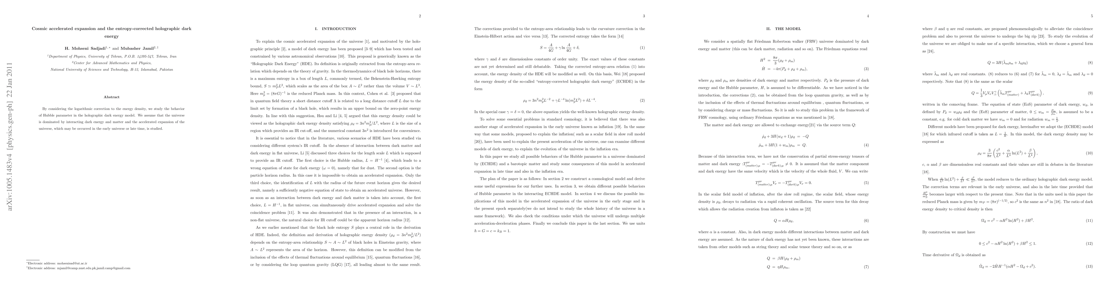 By considering the logarithmic correction to the energy density, we study the behavior of Hubble parameter in the holographic dark energy model. We assume that the universe is dominated by interacting dark energy and matter and the accelerated expansion of the universe, which may be occurred in the early universe or late time, is studied.