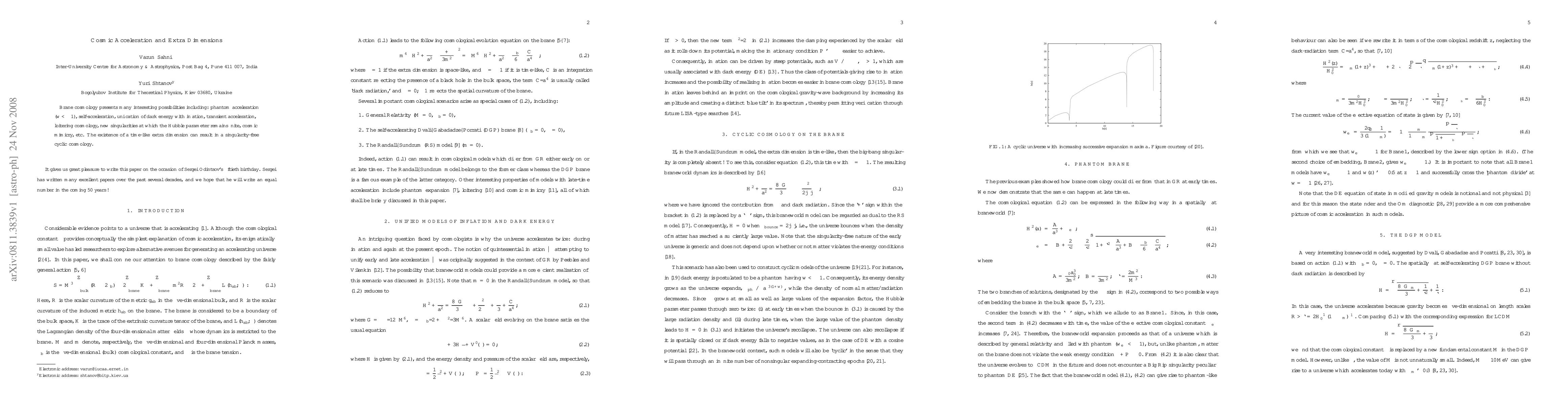 This paper explores brane cosmology's potential to explain cosmic acceleration through phenomena like phantom acceleration and cyclic cosmology, suggesting that a time-like extra dimension could lead to singularity-free, cyclic universe models.