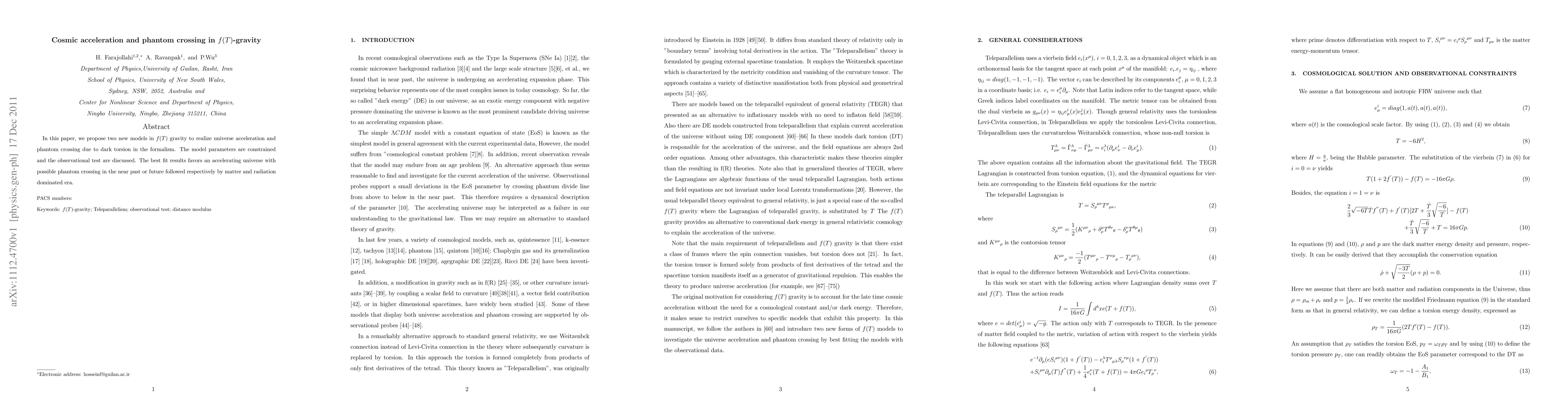 This paper proposes two $f(T)$-gravity models that simulate universe acceleration and phantom crossing through dark torsion, with the best fit suggesting an accelerating universe followed by a matter-dominated era.