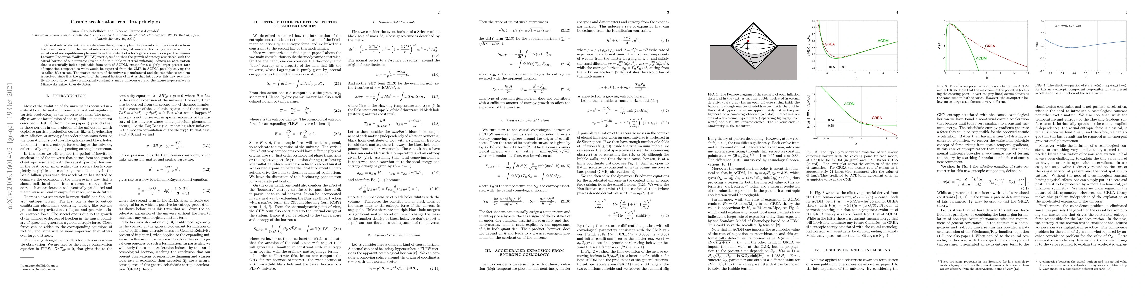 General relativistic entropic acceleration theory may explain the present cosmic acceleration from first principles without the need of introducing a cosmological constant. Following the covariant formulation of non-equilibrium phenomena in the context of a homogeneous and isotropic Friedmann-Lemaitre-Robertson-Walker (FLRW) metric, we find that the growth of entropy associated with the causal horizon of our universe (inside a finite bubble in eternal inflation) induces an acceleration that is essentially indistinguishable from that of $\Lambda$CDM, except for a slightly larger present rate of expansion compared to what would be expected from the CMB in $\Lambda$CDM, possibly solving the so-called $H_0$ tension. The matter content of the universe is unchanged and the coincidence problem is resolved since it is the growth of the causal horizon of matter that introduces this new relativistic entropic force. The cosmological constant is made unnecessary and the future hypersurface is Minkowsky rather than de Sitter.