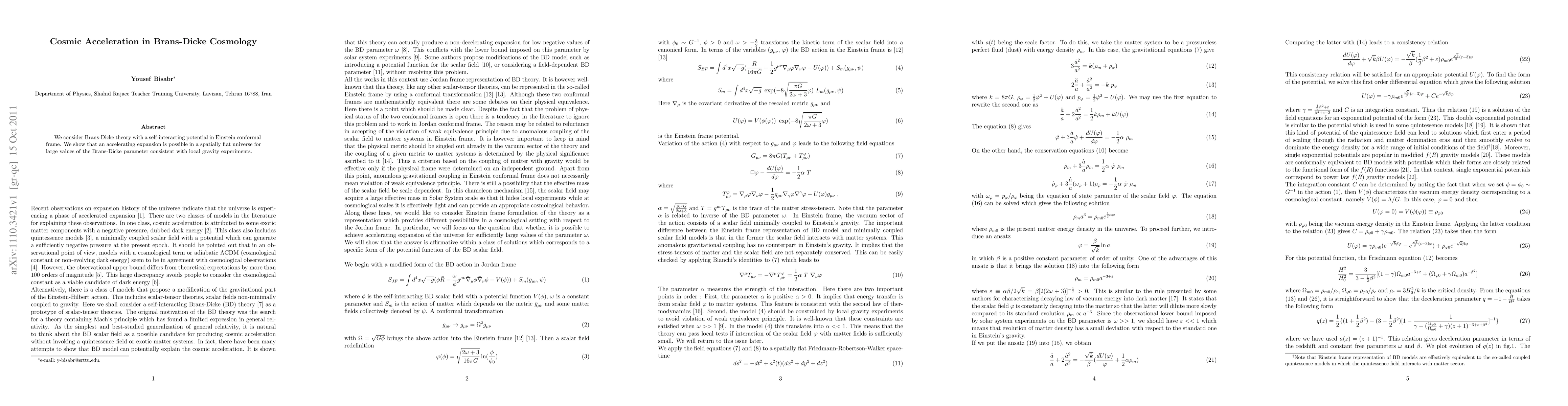 Summary: This paper explores Brans-Dicke theory with a self-interacting potential in the Einstein conformal frame, demonstrating that it can support an accelerating expansion in a spatially flat universe, even for large Brans-Dicke parameters that align with local gravity experiment constraints.