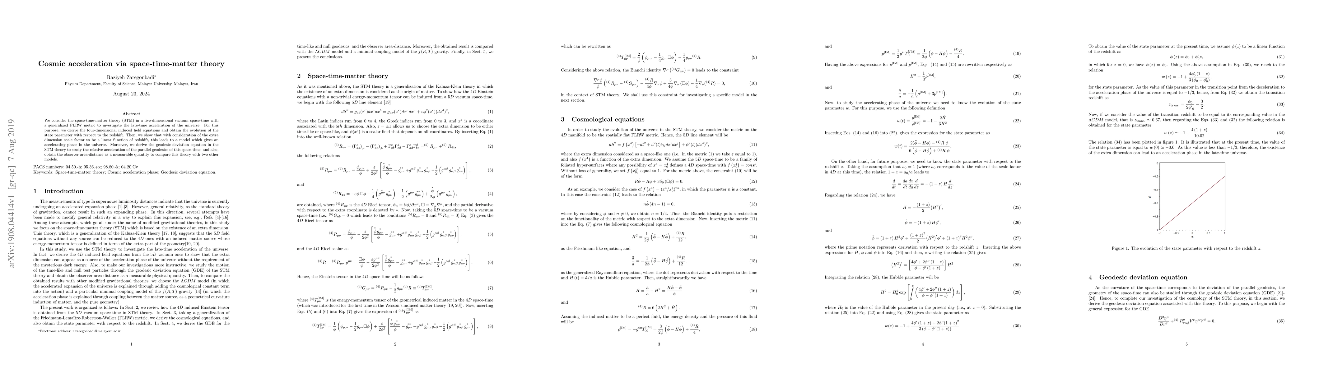 We consider the space-time-matter theory (STM) in a five-dimensional vacuum space-time with a generalized FLRW metric to investigate the late-time acceleration of the universe. For this purpose, we derive the four-dimensional induced field equations and obtain the evolution of the state parameter with respect to the redshift. Then, we show that with consideration of the extra dimension scale factor to be a linear function of redshift, this leads to a model which gives an accelerating phase in the universe. Moreover, we derive the geodesic deviation equation in the STM theory to study the relative acceleration of the parallel geodesics of this space-time, and also, obtain the observer area-distance as a measurable quantity to compare this theory with two other models.