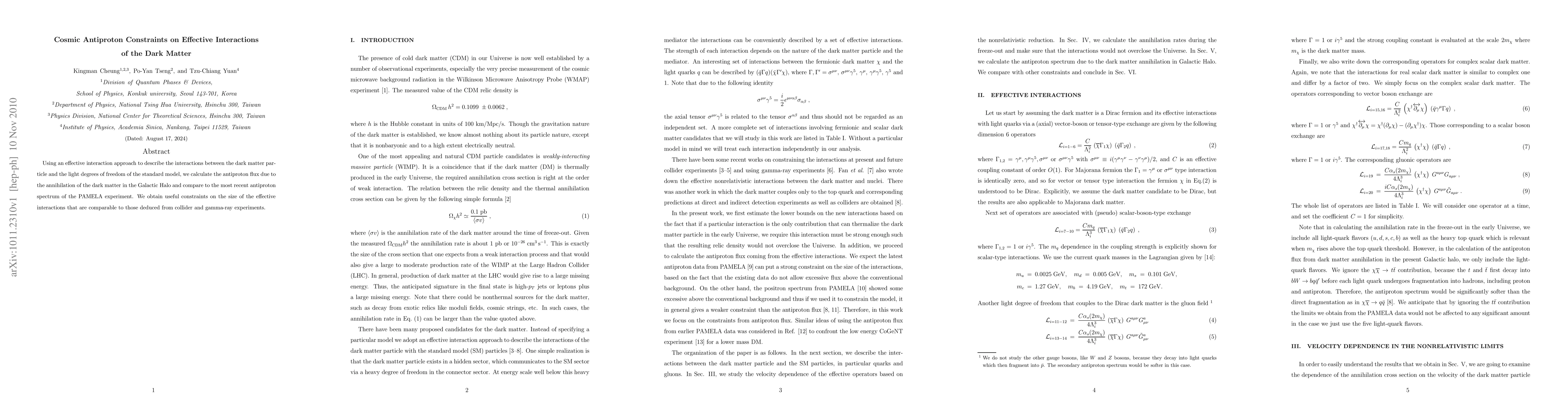 This paper uses an effective interaction model to study dark matter annihilation in the Galactic Halo, calculating the resulting antiproton flux and comparing it to PAMELA data, thereby deriving constraints on dark matter interaction strengths comparable to collider and gamma-ray experiment results.
