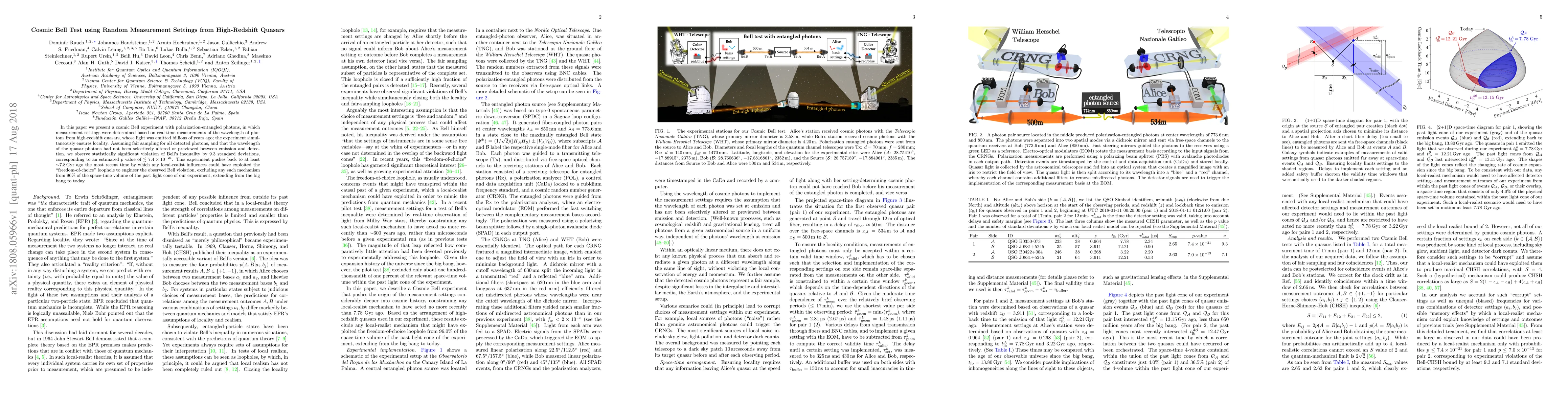 This paper reports a cosmic Bell test using entangled photons where measurement settings were dynamically determined by high-redshift quasars' light, revealing a $9.3$ standard deviation violation of Bell's inequality, thus ruling out local-realist influences for $96\%$ of the past light cone's space-time volume.