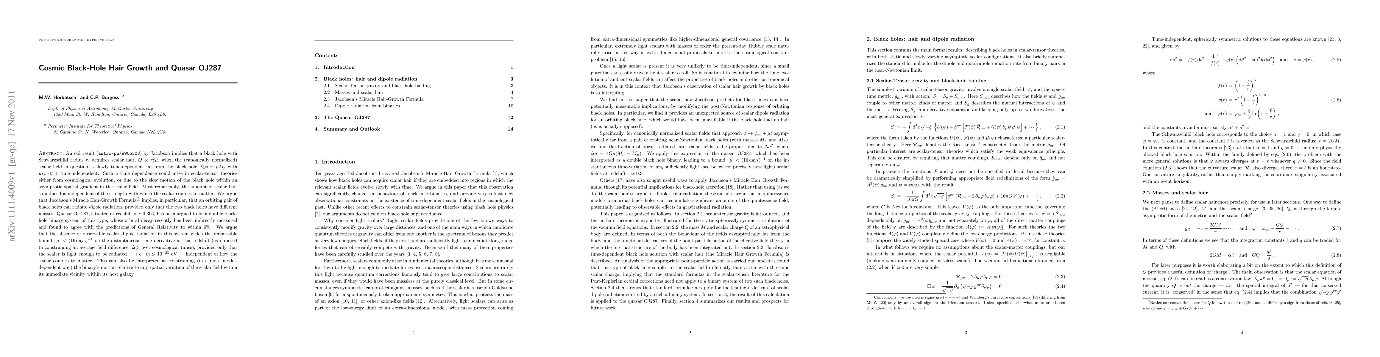 An old result ({\tt astro-ph/9905303}) by Jacobson implies that a black hole with Schwarzschild radius $r_s$ acquires scalar hair, $Q \propto r_s^2 \mu$, when the (canonically normalized) scalar field in question is slowly time-dependent far from the black hole, $\partial_t \phi \simeq \mu M_p$ with $\mu r_s \ll 1$ time-independent. Such a time dependence could arise in scalar-tensor theories either from cosmological evolution, or due to the slow motion of the black hole within an asymptotic spatial gradient in the scalar field. Most remarkably, the amount of scalar hair so induced is independent of the strength with which the scalar couples to matter. We argue that Jacobson's Miracle Hair-Growth Formula${}^\copyright$ implies, in particular, that an orbiting pair of black holes can radiate {\em dipole} radiation, provided only that the two black holes have different masses. Quasar OJ 287, situated at redshift $z \simeq 0.306$, has been argued to be a double black-hole binary system of this type, whose orbital decay recently has been indirectly measured and found to agree with the predictions of General Relativity to within 6%. We argue that the absence of observable scalar dipole radiation in this system yields the remarkable bound $|\,\mu| < (16 \, \hbox{days})^{-1}$ on the instantaneous time derivative at this redshift (as opposed to constraining an average field difference, $\Delta \phi$, over cosmological times), provided only that the scalar is light enough to be radiated --- i.e. $m \lsim 10^{-23}$ eV --- independent of how the scalar couples to matter. This can also be interpreted as constraining (in a more model-dependent way) the binary's motion relative to any spatial variation of the scalar field within its immediate vicinity within its host galaxy.