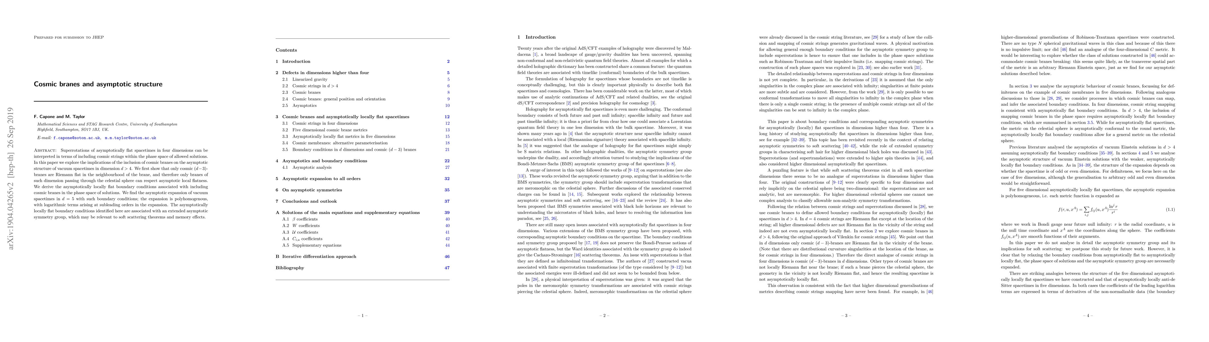 Superrotations of asymptotically flat spacetimes in four dimensions can be interpreted in terms of including cosmic strings within the phase space of allowed solutions. In this paper we explore the implications of the inclusion of cosmic branes on the asymptotic structure of vacuum spacetimes in dimension d > 4. We first show that only cosmic (d-3)-branes are Riemann flat in the neighbourhood of the brane, and therefore only branes of such dimension passing through the celestial sphere can respect asymptotic local flatness. We derive the asymptotically locally flat boundary conditions associated with including cosmic branes in the phase space of solutions. We find the asymptotic expansion of vacuum spacetimes in d=5 with such boundary conditions; the expansion is polyhomogenous, with logarithmic terms arising at subleading orders in the expansion. The asymptotically locally flat boundary conditions identified here are associated with an extended asymptotic symmetry group, which may be relevant to soft scattering theorems and memory effects.