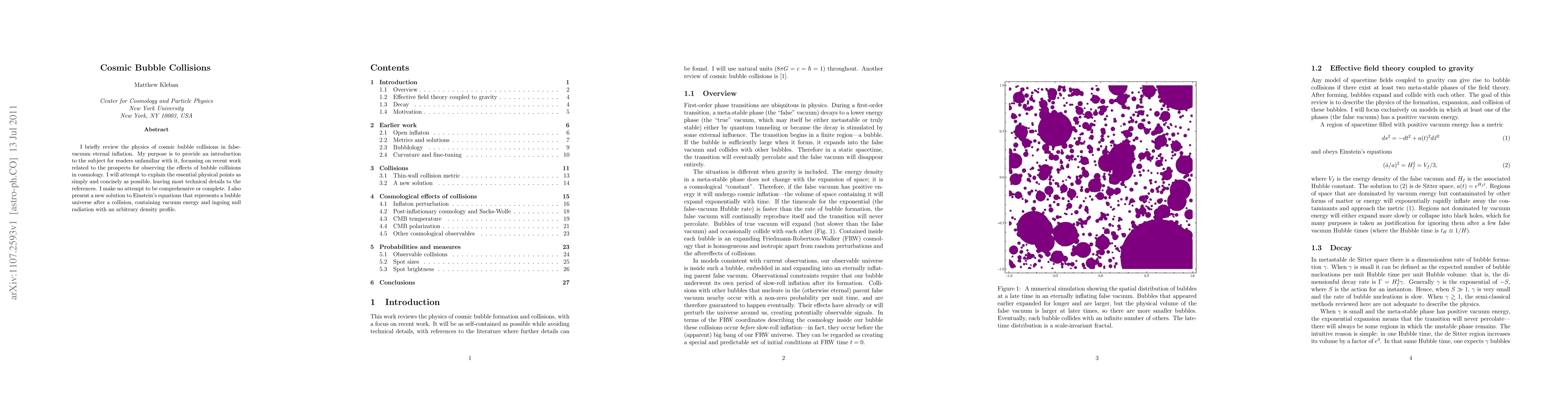 This paper reviews the physics of cosmic bubble collisions in the context of eternal inflation, focusing on recent observational prospects. It introduces the subject for newcomers and presents a new solution to Einstein's equations describing a post-collision bubble universe with vacuum energy and ingoing null radiation.
