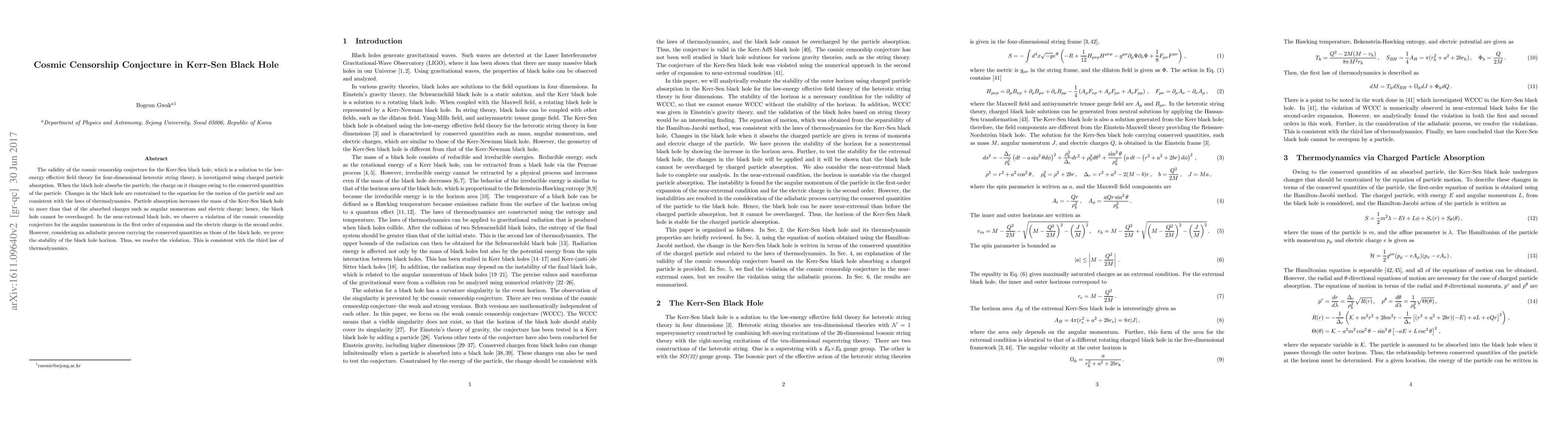 This paper investigates the cosmic censorship conjecture in Kerr-Sen black holes using charged particle absorption, revealing violations near extremality but proving stability via adiabatic processes, consistent with thermodynamic laws.