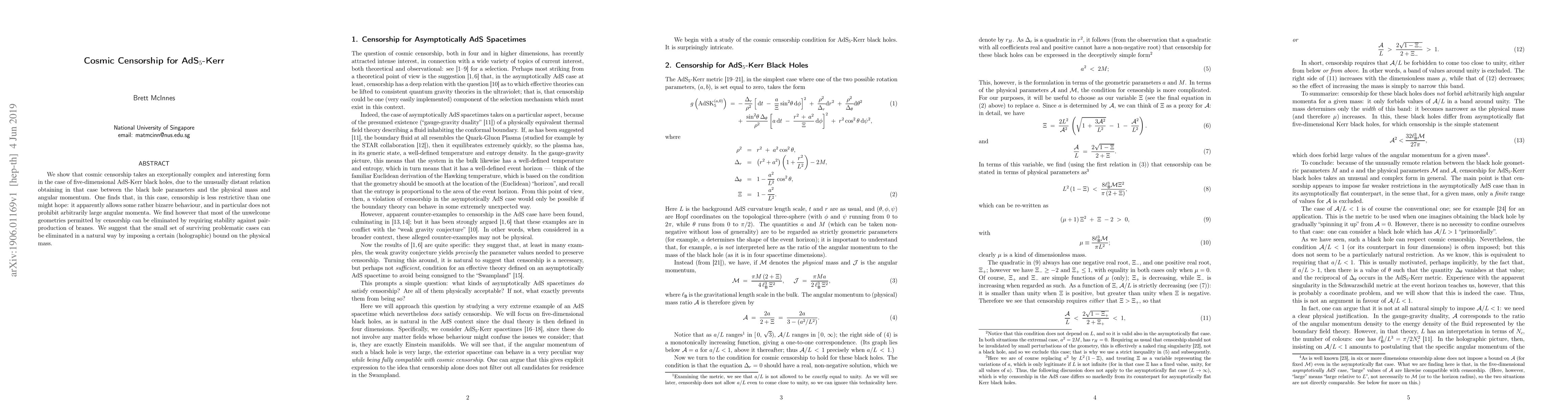 We show that cosmic censorship takes an exceptionally complex and interesting form in the case of five-dimensional AdS-Kerr black holes, due to the unusually distant relation obtaining in that case between the black hole parameters and the physical mass and angular momentum. One finds that, in this case, censorship is less restrictive than one might hope: it apparently allows some rather bizarre behaviour, and in particular does not prohibit arbitrarily large angular momenta. We find however that most of the unwelcome geometries permitted by censorship can be eliminated by requiring stability against pair-production of branes. We suggest that the small set of surviving problematic cases can be eliminated in a natural way by imposing a certain (holographic) bound on the physical mass.