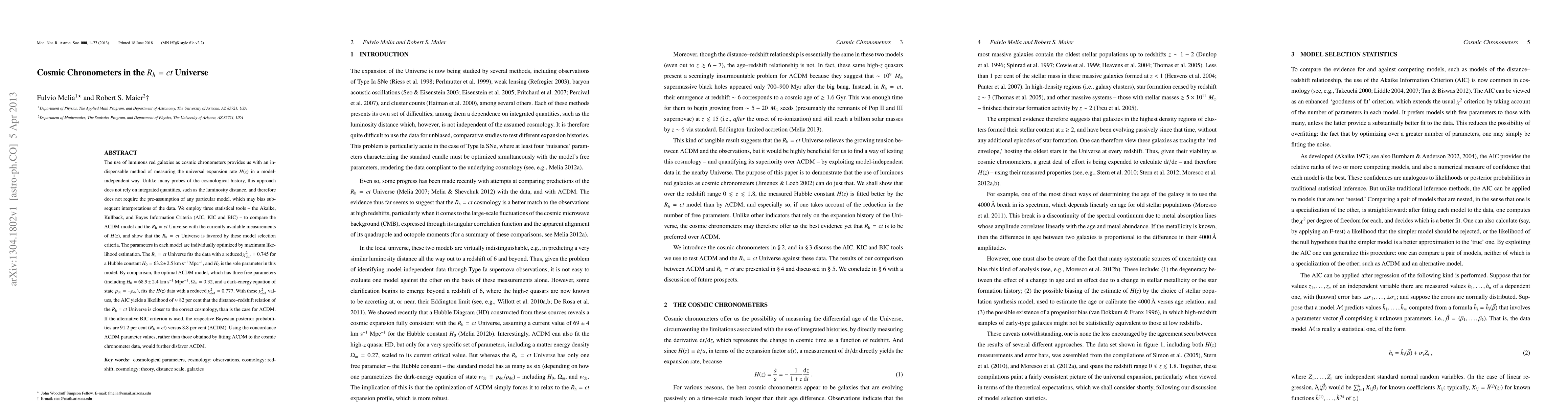 The use of luminous red galaxies as cosmic chronometers provides us with an indispensable method of measuring the universal expansion rate H(z) in a model-independent way. Unlike many probes of the cosmological history, this approach does not rely on integrated quantities, such as the luminosity distance, and therefore does not require the pre-assumption of any particular model, which may bias subsequent interpretations of the data. We employ three statistical tools -- the Akaike, Kullback, and Bayes Information Criteria (AIC, KIC and BIC) -- to compare the LCDM model and the R_h=ct Universe with the currently available measurements of H(z), and show that the R_h=ct Universe is favored by these model selection criteria. The parameters in each model are individually optimized by maximum likelihood estimation. The R_h=ct Universe fits the data with a reduced chi^2_dof=0.745 for a Hubble constant H_0=63.2+/-2.5 km/s/Mpc, and H_0 is the sole parameter in this model. By comparison, the optimal LCDM model, which has three free parameters (including H_0=68.9+/-2.4 km/s/Mpc, Omega_m=0.32, and a dark-energy equation of state p_de=-rho_de), fits the H(z) data with a reduced chi^2_dof=0.777. With these chi^2_dof values, the AIC yields a likelihood of about 82 per cent that the distance--redshift relation of the R_h=ct Universe is closer to the correct cosmology, than is the case for LCDM. If the alternative BIC criterion is used, the respective Bayesian posterior probabilities are 91.2 per cent (R_h=ct) versus 8.8 per cent (LCDM). Using the concordance LCDM parameter values, rather than those obtained by fitting LCDM to the cosmic chronometer data, would further disfavor LCDM.