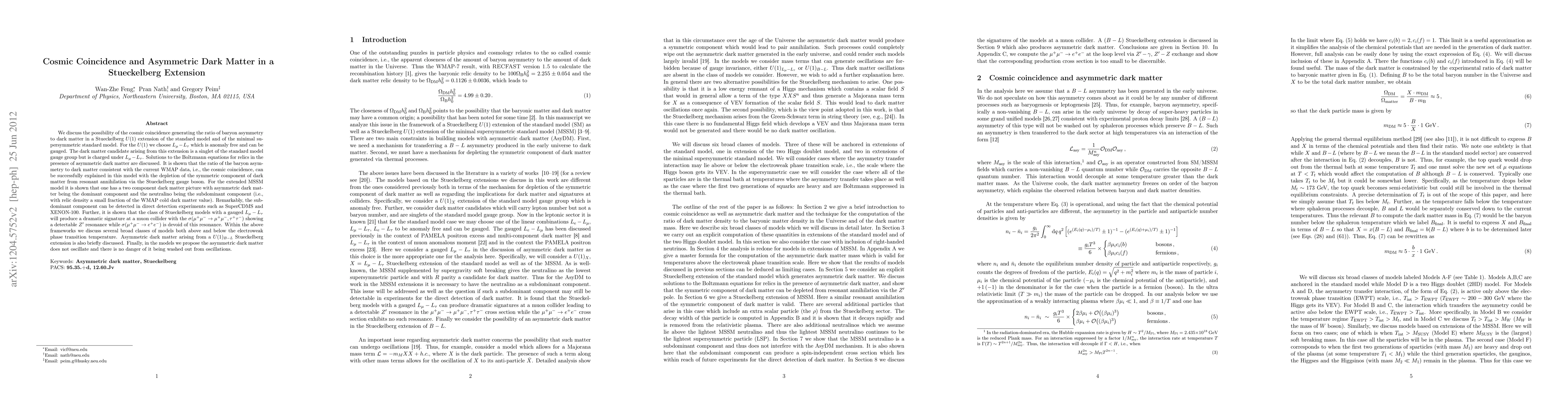 This paper explores the cogenesis mechanism generating the ratio of baryon asymmetry to dark matter in Stueckelberg extensions of the Standard Model and MSSM, focusing on the gauged $L_{\mu}-L_{\tau}$ symmetry. It demonstrates that asymmetric dark matter can explain the cosmic coincidence and predicts detectable signatures at colliders and direct detection experiments.