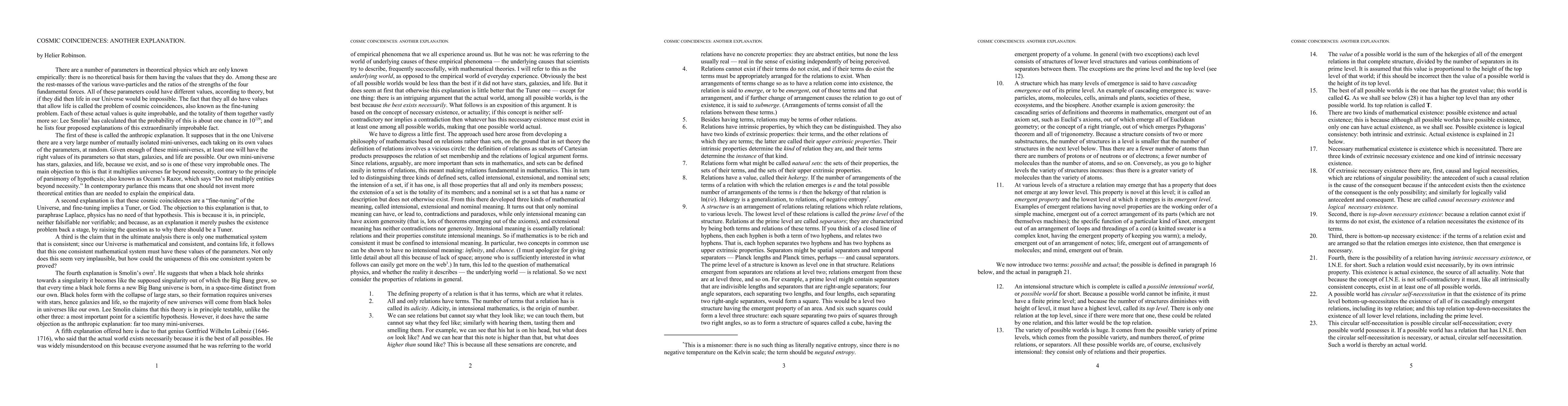 Arising out of an attempt at a new foundations of mathematics, in which relations are more primitive than sets, and out of the theoretical physicists' concept of underlying causes of empirical phenomena, the idea of a purely mathematical possible world (of underlying causes) is developed. It is shown that at least one, and at most one, possible world is actual, and that the one that is actual is the best (as in the philosophy of Leibniz), and therefore requires the cosmic coincidences to exist. This best is actual necessarily because of having a higher level top relation than any other possible world, and because of this top relation possessing the property of intrinsic necessary existence.