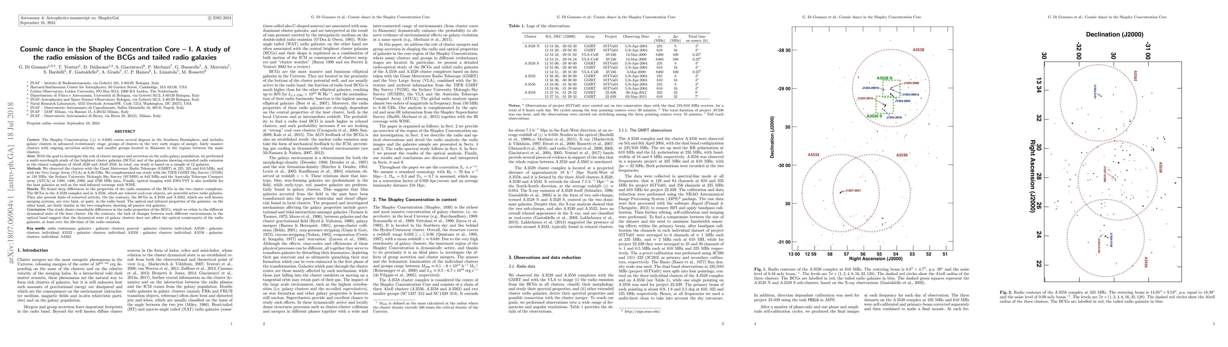The Shapley Concentration ($z\approx0.048$) covers several degrees in the Southern Hemisphere, and includes galaxy clusters in advanced evolutionary stage, groups of clusters in the early stages of merger, fairly massive clusters with ongoing accretion activity, and smaller groups located in filaments in the regions between the main clusters. With the goal to investigate the role of cluster mergers and accretion on the radio galaxy population, we performed a multi-wavelength study of the BCGs and of the galaxies showing extended radio emission in the cluster complexes of Abell 3528 and Abell 3558. Our study is based on a sample of 12 galaxies. We observed the clusters with the GMRT at 235, 325 and 610 MHz, and with the VLA at 8.46 GHz. We complemented our study with the TGSS at 150 MHz, the SUMSS at 843 MHz and ATCA at 1380, 1400, 2380, and 4790 MHz data. Optical imaging with ESO-VST and mid-IR coverage with WISE are also available for the host galaxies. We found deep differences in the properties of the radio emission of the BCGs in the two cluster complexes. The BCGs in the A3528 complex and in A3556, which are relaxed cool-core objects, are powerful active radio galaxies. They also present hints of restarted activity. On the contrary, the BCGs in A3558 and A3562, which are well known merging systems, are very faint, or quiet, in the radio band. The optical and IR properties of the galaxies are fairly similar in the two complexes, showing all passive red galaxies. Our study shows remarkable differences in the radio properties of the BGCs, which we relate to the different dynamical state of the host cluster. On the contrary, the lack of changes between such different environments in the optical band suggests that the dynamical state of galaxy clusters does not affect the optical counterparts of the radio galaxies, at least over the life-time of the radio emission.