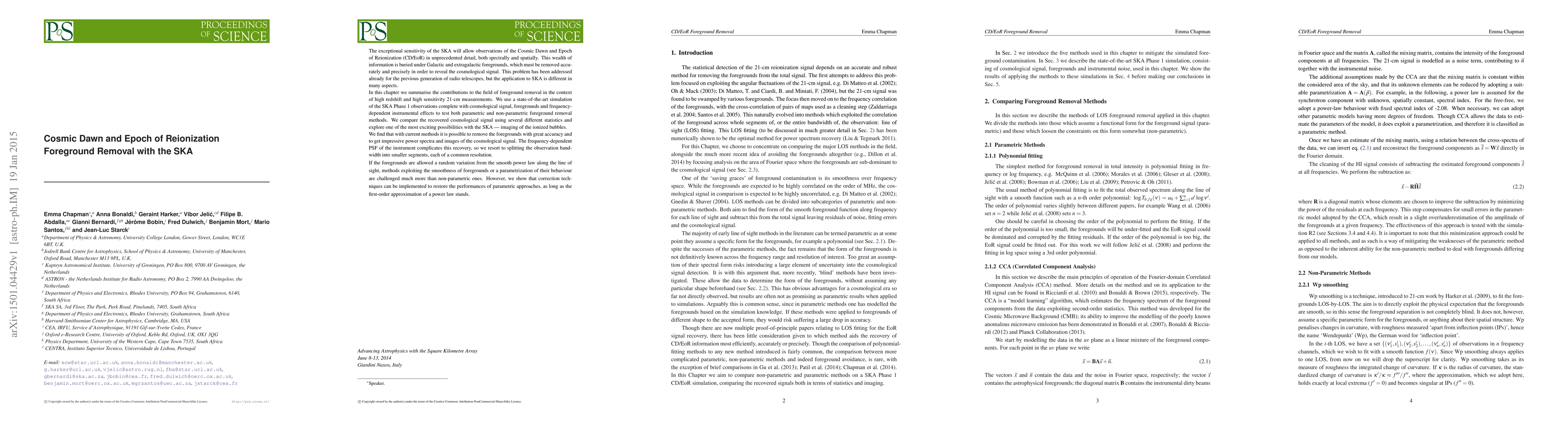 This paper discusses the challenges of removing Galactic and extragalactic foregrounds to observe the Cosmic Dawn and Epoch of Reionization using the SKA's high sensitivity. It evaluates both parametric and non-parametric methods, finding that while current techniques can accurately remove foregrounds, frequency-dependent instrumental effects require splitting the observation bandwidth for better resolution.