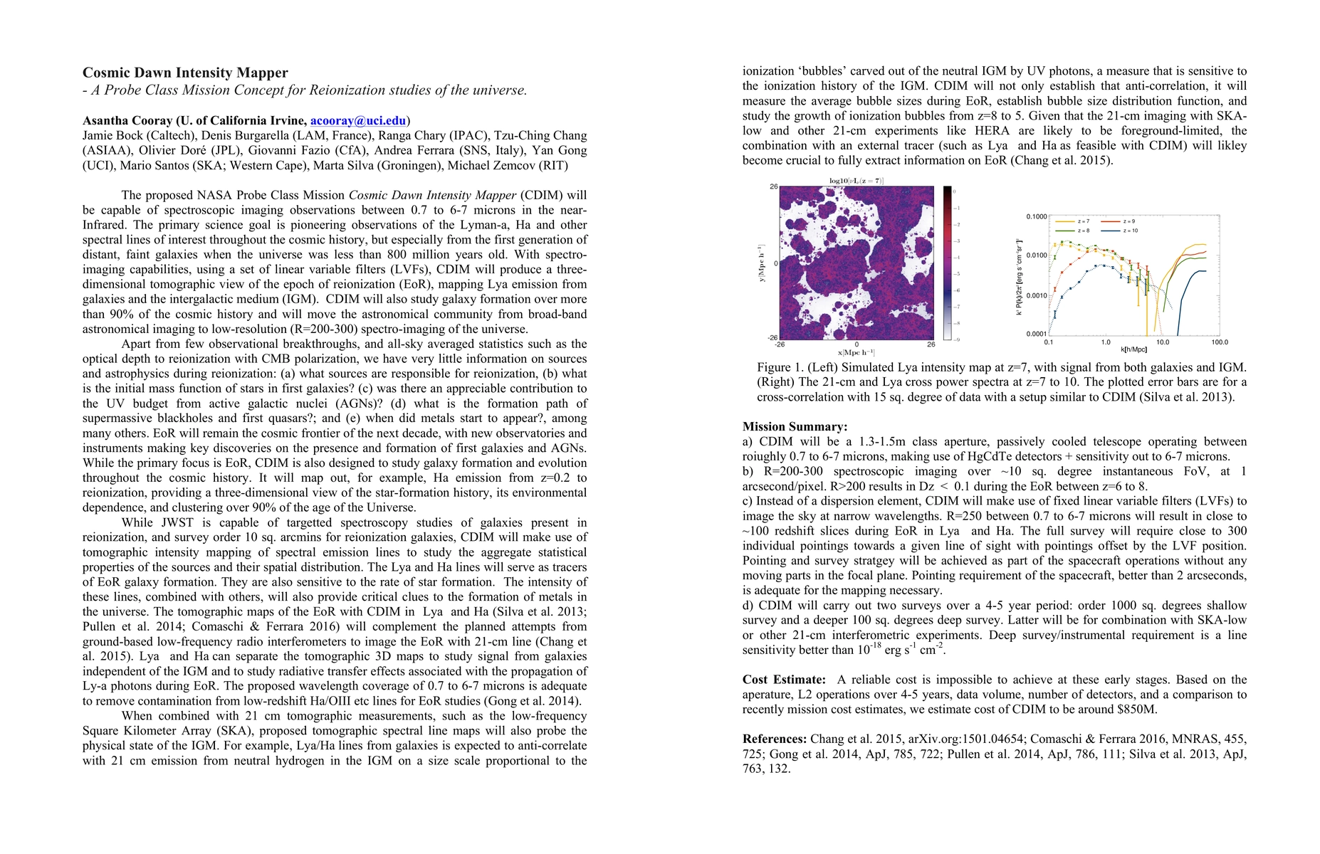 The Cosmic Dawn Intensity Mapper (CDIM) is a proposed mission for studying the universe's reionization through near-infrared spectroscopic imaging. It aims to observe spectral emission lines from the first galaxies, providing a three-dimensional view of the epoch of reionization and advancing galaxy formation studies throughout cosmic history.