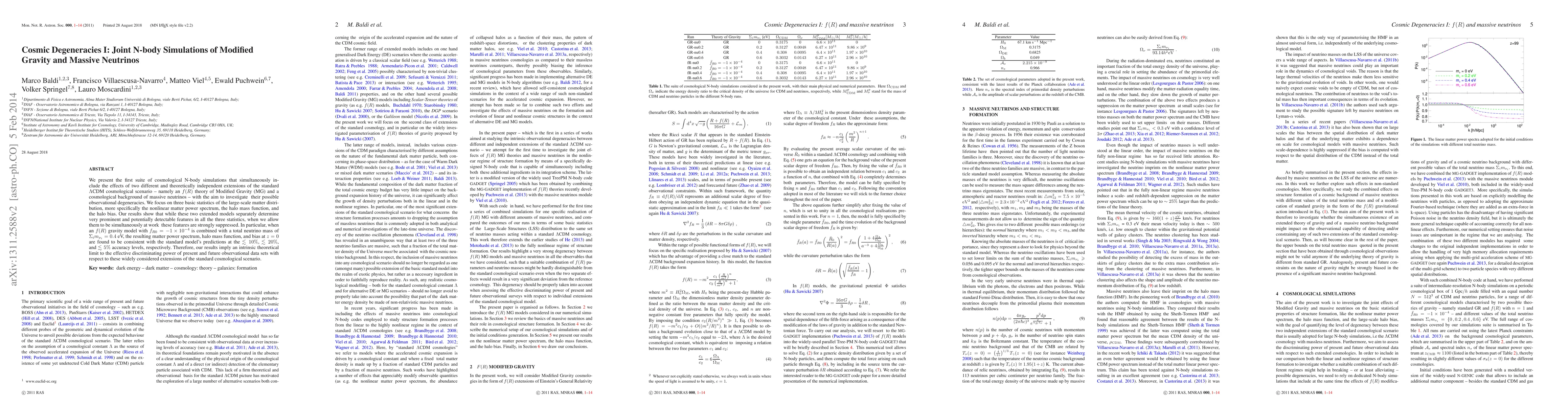 We present the first suite of cosmological N-body simulations that simultaneously include the effects of two different and theoretically independent extensions of the standard $\Lambda$CDM cosmological scenario - namely an $f(R)$ theory of Modified Gravity (MG) and a cosmological background of massive neutrinos - with the aim to investigate their possible observational degeneracies. We focus on three basic statistics of the large-scale matter distribution, more specifically the nonlinear matter power spectrum, the halo mass function, and the halo bias, for which we determine the deviation with respect to the fiducial $\Lambda$CDM cosmology in the context of both separate and combined simulations of $f(R)$ MG and massive neutrinos scenarios. Our results show that while these two extended models separately determine very prominent and potentially detectable features in all the three statistics, when we allow them to be simultaneously at work these features are strongly suppressed, resulting in much weaker deviations from the standard model's predictions. In particular, when an $f(R)$ gravity model with $f_{R0}=-1\times 10^{-4}$ is combined with a total neutrino mass of $\Sigma _{i}m_{\nu _{i}}=0.4$ eV, the resulting matter power spectrum, halo mass function, and bias at z=0 are found to be consistent with the standard model's predictions at the 10%, 20%, and 5% accuracy levels, respectively. Therefore, our results imply an intrinsic theoretical limit to the effective discriminating power of present and future observational data sets with respect to these widely considered extensions of the standard cosmological scenario in the absence of independent measurements of the neutrino masses from laboratory experiments, even though the high-redshift evolution might still allow to partially break the degeneracy [Abridged].