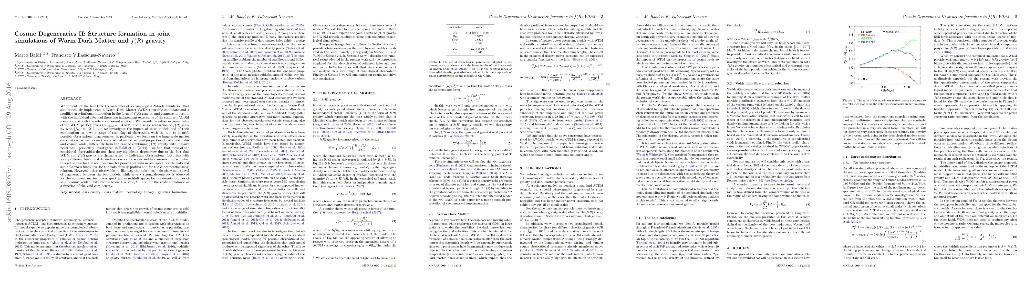 We present for the first time the outcomes of a cosmological N-body simulation that simultaneously implements a Warm Dark Matter (WDM) particle candidate and a modified gravitational interaction in the form of $f(R)$ gravity, and compare its results with the individual effects of these two independent extensions of the standard $\Lambda $CDM scenario, and with the reference cosmology itself. We consider a rather extreme value of the WDM particle mass ($m_{\rm WDM}=0.4$ keV) and a single realisation of $f(R)$ gravity with $|\bar{f}_{R0}|=10^{-5}$, and we investigate the impact of these models and of their combination on a wide range of cosmological observables with the aim to identify possible observational degeneracies. In particular, we focus on the large-scale matter distribution, as well as on the statistical and structural properties of collapsed halos and cosmic voids. Differently from the case of combining $f(R)$ gravity with massive neutrinos -- previously investigated in Baldi et al. (2014) -- we find that most of the considered observables do not show any significant degeneracy due to the fact that WDM and $f(R)$ gravity are characterised by individual observational footprints with a very different functional dependence on cosmic scales and halo masses. In particular, this is the case for the nonlinear matter power spectrum in real space, for the halo and sub-halo mass functions, for the halo density profiles and for the concentration-mass relation. However, other observables -- like e.g. the halo bias -- do show some level of degeneracy between the two models, while a very strong degeneracy is observed for the nonlinear matter power spectrum in redshift space, for the density profiles of small cosmic voids -- with radius below $\approx 5$ Mpc$/h$ -- and for the voids abundance as a function of the void core density.
