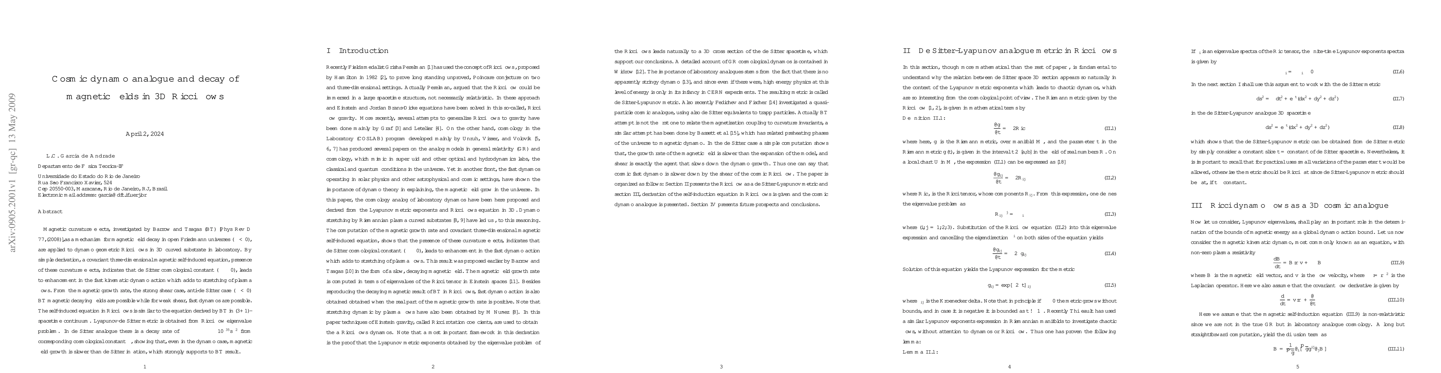 Magnetic curvature effects, investigated by Barrow and Tsagas (BT) [Phys Rev D \textbf{77},(2008)],as a mechanism for magnetic field decay in open Friedmann universes (${\Lambda}<0$), are applied to dynamo geometric Ricci flows in 3D curved substrate in laboratory. By simple derivation, a covariant three-dimensional magnetic self-induced equation, presence of these curvature effects, indicates that de Sitter cosmological constant (${\Lambda}\ge{0}$), leads to enhancement in the fast kinematic dynamo action which adds to stretching of plasma flows. From the magnetic growth rate, the strong shear case, anti-de Sitter case (${\Lambda}<0$) BT magnetic decaying fields are possible while for weak shear, fast dynamos are possible. The self-induced equation in Ricci flows is similar to the equation derived by BT in $(3+1)$-spacetime continuum. Lyapunov-de Sitter metric is obtained from Ricci flow eigenvalue problem. In de Sitter analogue there is a decay rate of ${\gamma}\approx{-{\Lambda}}\approx{-10^{-35}s^{-2}}$ from corresponding cosmological constant ${\Lambda}$, showing that, even in the dynamo case, magnetic field growth is slower than de Sitter inflation, which strongly supports to BT result.