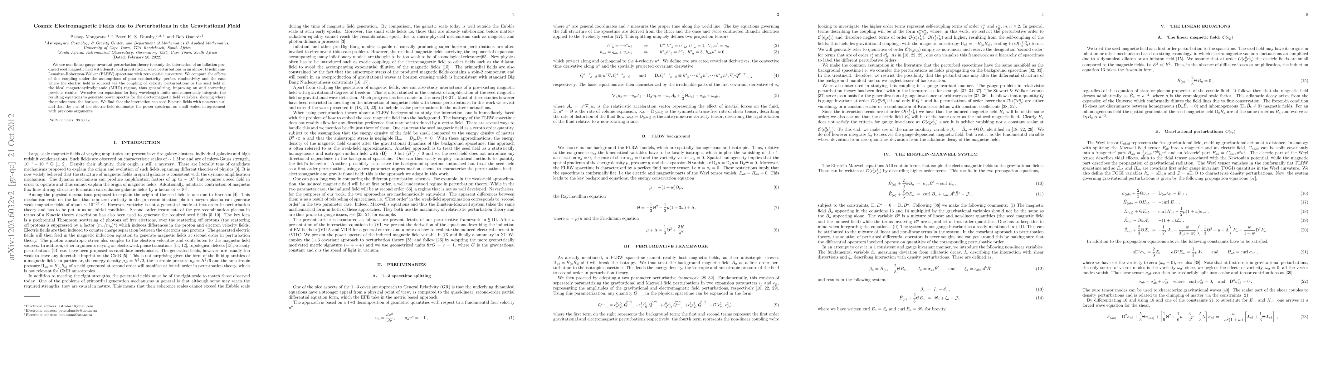 We use non-linear gauge-invariant perturbation theory to study the interaction of an inflation produced seed magnetic field with density and gravitational wave perturbations in an almost Friedmann-Lema\^itre-Robertson-Walker (FLRW) spacetime. We compare the effects of this coupling under the assumptions of poor conductivity, infinite conductivity and the case where the electric field is sourced via the coupling of velocity perturbations to the seed field in the ideal magnetohydrodynamic (MHD) regime, thus generalizing, improving on and correcting previous results. We solve our equations for long wavelength limits and numerically integrate the resulting equations to generate power spectra for the electromagnetic field variables, showing where the modes cross the horizon. We find that the rotation of the electric field dominates the power spectrum on small scales, in agreement with previous arguments.