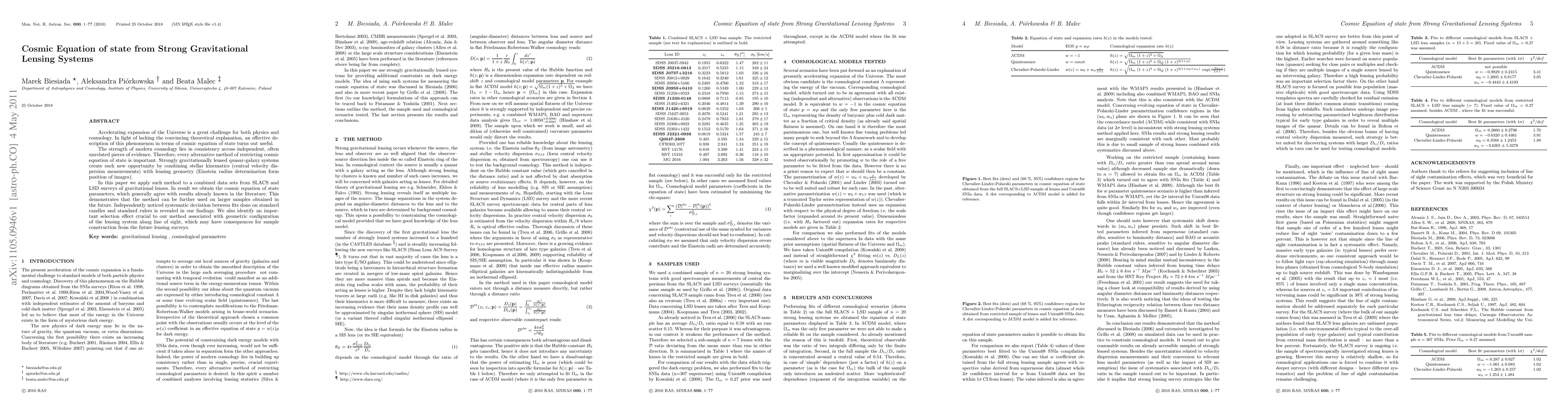 Accelerating expansion of the Universe is a great challenge for both physics and cosmology. In light of lacking the convincing theoretical explanation, an effective description of this phenomenon in terms of cosmic equation of state turns out useful. The strength of modern cosmology lies in consistency across independent, often unrelated pieces of evidence. Therefore, every alternative method of restricting cosmic equation of state is important. Strongly gravitationally lensed quasar-galaxy systems create such new opportunity by combining stellar kinematics (central velocity dispersion measurements) with lensing geometry (Einstein radius determination form position of images). In this paper we apply such method to a combined data sets from SLACS and LSD surveys of gravitational lenses. In result we obtain the cosmic equation of state parameters, which generally agree with results already known in the literature. This demonstrates that the method can be further used on larger samples obtained in the future. Independently noticed systematic deviation between fits done on standard candles and standard rulers is revealed in our findings. We also identify an important selection effect crucial to our method associated with geometric configuration of the lensing system along line of sight, which may have consequences for sample construction from the future lensing surveys.