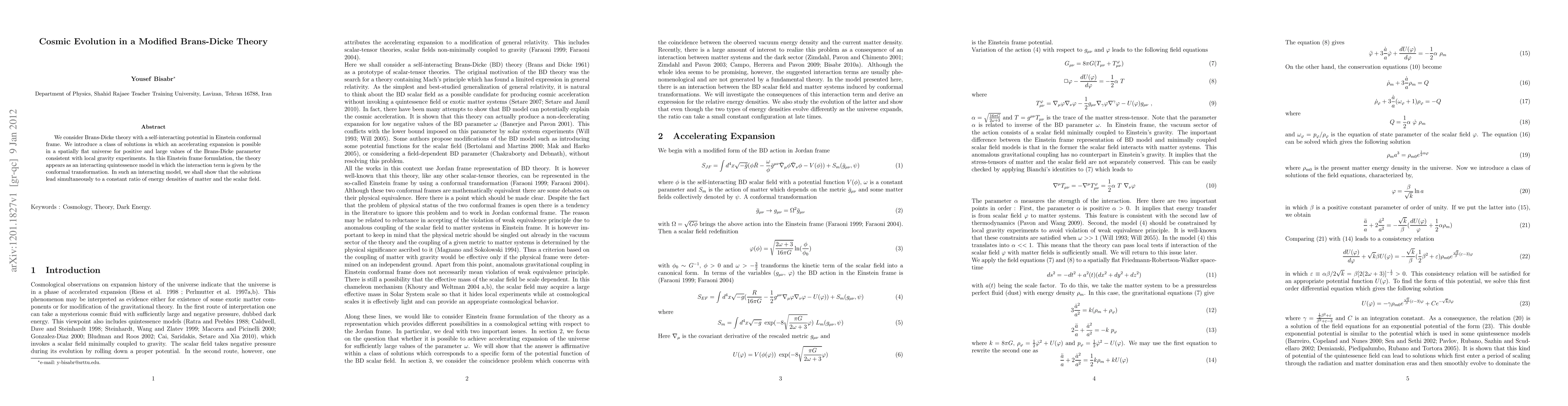 This paper explores a modified Brans-Dicke theory in the Einstein conformal frame, presenting solutions that enable an accelerating universe expansion under spatially flat conditions. It introduces an interacting quintessence model with a constant ratio of matter and scalar field energy densities.