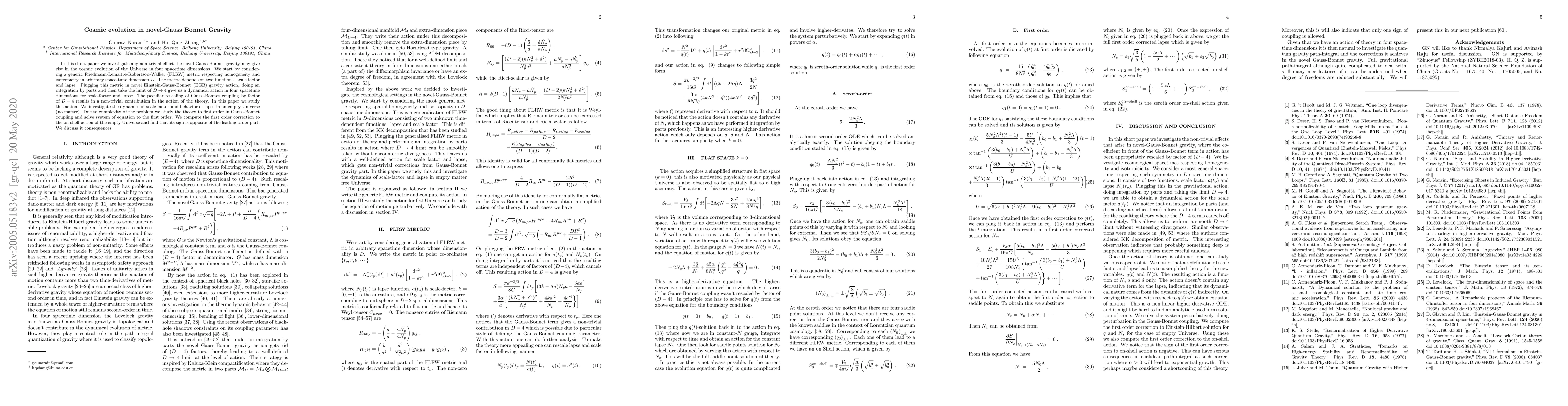 In this short paper we investigate any non-trivial effect the novel Gauss-Bonnet gravity may give rise in the cosmic evolution of the Universe in four spacetime dimensions. We start by considering a generic Friedmann-Lema\^itre-Robertson-Walker (FLRW) metric respecting homogeneity and isotropicity in arbitrary space-time dimension $D$. The metric depends on two functions: scale factor and lapse. Plugging this metric in novel Einstein-Gauss-Bonnet (EGB) gravity action, doing an integration by parts and then take the limit of $D\to4$ give us a dynamical action in four spacetime dimensions for scale factor and lapse. The peculiar rescaling of Gauss-Bonnet coupling by factor of $D-4$ results in a non-trivial contribution in the action of the theory. In this paper we study this action. We investigate the dynamics of scale-factor and behavior of lapse in an empty Universe (no matter). Due to complexity of the problem we study the theory to first order in Gauss-Bonnet coupling and solve system of equation to the first order. We compute the first order correction to the on-shell action of the empty Universe and find that its sign is opposite of the leading order part. We discuss it consequences.