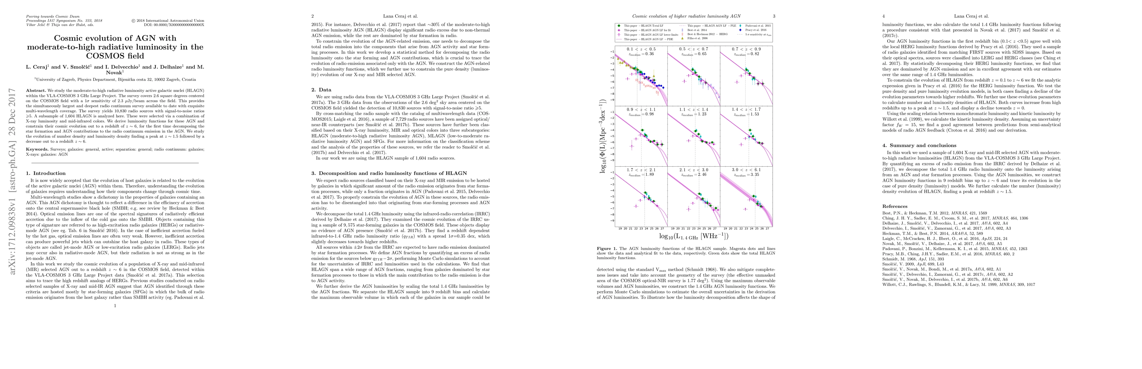 This paper investigates the cosmic evolution of high radiative luminosity active galactic nuclei (HLAGN) in the COSMOS field using the VLA-COSMOS 3 GHz survey, revealing a peak in number density and luminosity density at $z\sim1.5$ and a subsequent decline up to $z\sim6$. The study also distinguishes between star formation and AGN contributions to radio emission.