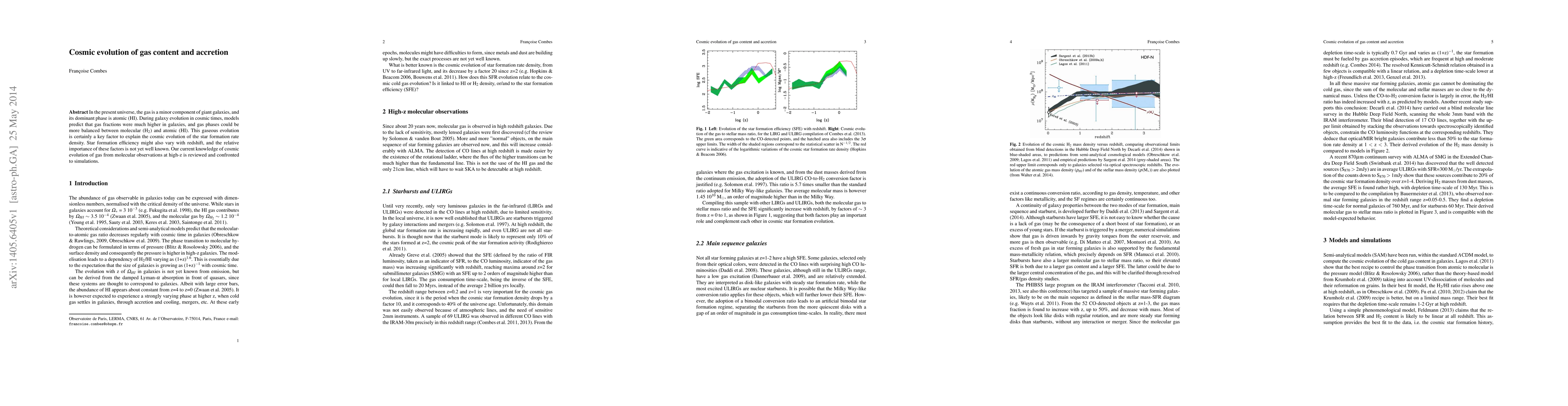 In the present universe, the gas is a minor component of giant galaxies, and its dominant phase is atomic (HI). During galaxy evolution in cosmic times, models predict that gas fractions were much higher in galaxies, and gas phases could be more balanced between molecular (H2) and atomic (HI). This gaseous evolution is certainly a key factor to explain the cosmic evolution of the star formation rate density. Star formation efficiency might also vary with redshift, and the relative importance of these factors is not yet well known. Our current knowledge of cosmic evolution of gas from molecular observations at high-z is reviewed and confronted to simulations.