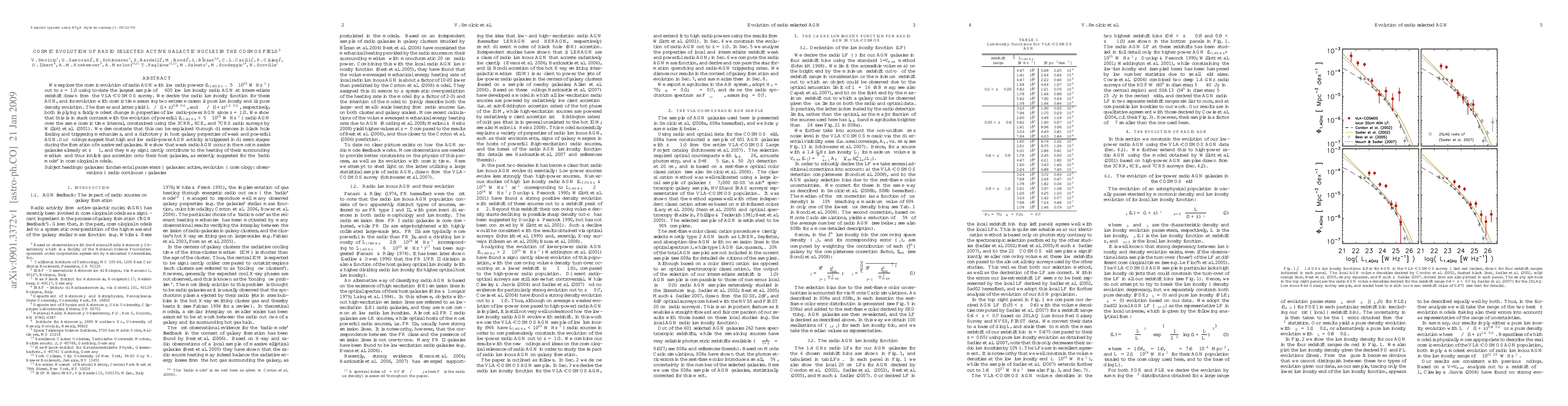 We explore the cosmic evolution of radio AGN with low radio powers (L_1.4GHz < 5\times10^25 W/Hz) out to z=1.3 using to-date the largest sample of ~600 low luminosity radio AGN at intermediate redshift drawn from the VLA-COSMOS survey. We derive the radio luminosity function for these AGN, and its evolution with cosmic time assuming two extreme cases: i) pure luminosity and ii) pure density evolution. The former and latter yield L_*\propto(1+z)^(0.8+/-0.1), and Phi*\propto (1+z)^(1.1+/-0.1), respectively, both implying a fairly modest change in properties of low radio-power AGN since z=1.3. We show that this is in stark contrast with the evolution of powerful (L_1.4GHz > 5\times10^25 W/Hz) radio AGN over the same cosmic time interval, constrained using the 3CRR, 6CE, and 7CRS radio surveys by Willott et al. (2001). We demonstrate that this can be explained through differences in black hole fueling and triggering mechanisms, and a dichotomy in host galaxy properties of weak and powerful AGN. Our findings suggest that high and low radio-power AGN activity is triggered in different stages during the formation of massive red galaxies. We show that weak radio AGN occur in the most massive galaxies already at z~1, and they may significantly contribute to the heating of their surrounding medium and thus inhibit gas accretion onto their host galaxies, as recently suggested for the `radio mode' in cosmological models.