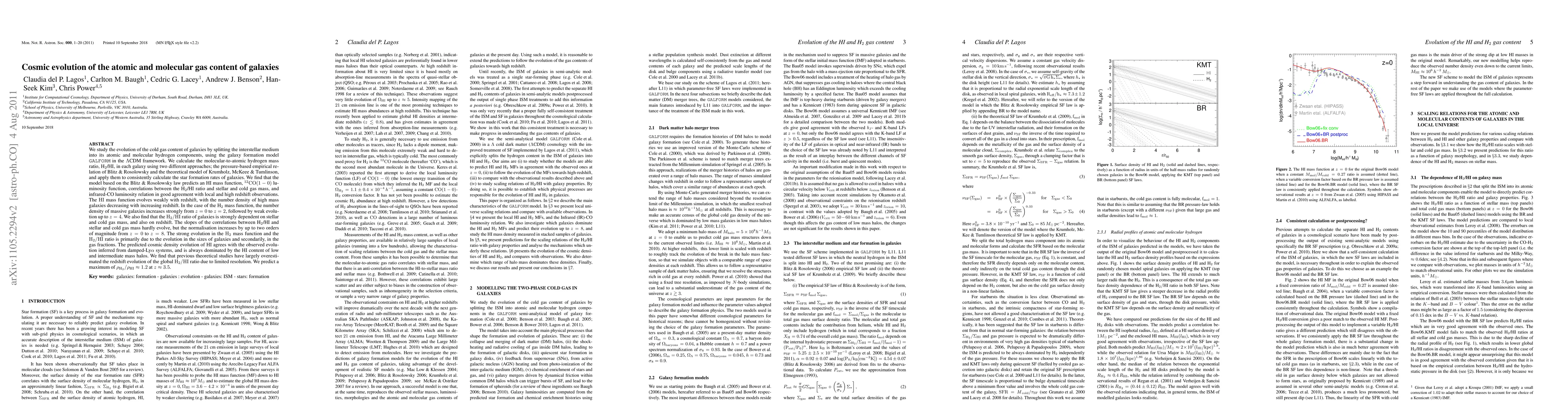 This paper investigates the cosmic evolution of atomic and molecular gas in galaxies using the GALFORM model, finding that the H2 mass function increases significantly from z=0 to z=2, with the H2/HI ratio strongly dependent on stellar and cold gas mass and redshift. The model predicts good agreement with observations and highlights the evolution in galaxy sizes and gas fractions as primary drivers.