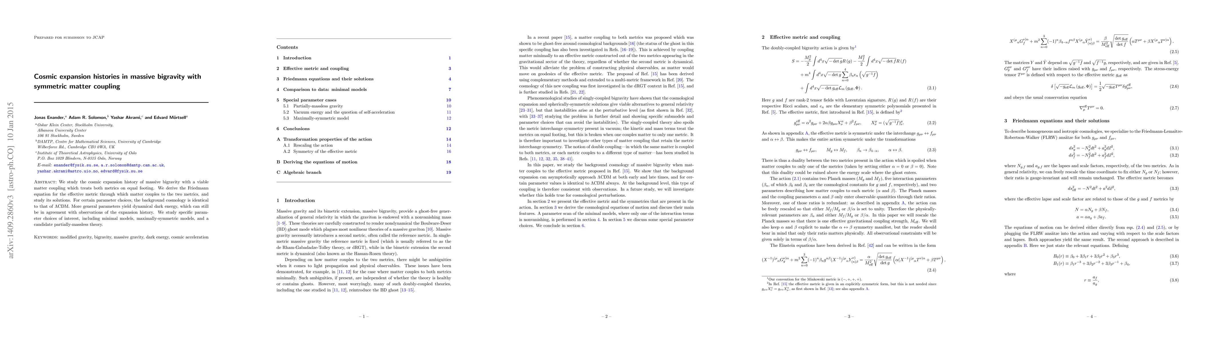 This paper investigates the cosmic expansion in massive bigravity with symmetric matter coupling, deriving the Friedmann equation for the effective metric. It finds that under certain parameters, the cosmology matches LCDM, while other parameters allow for dynamical dark energy consistent with observational data.