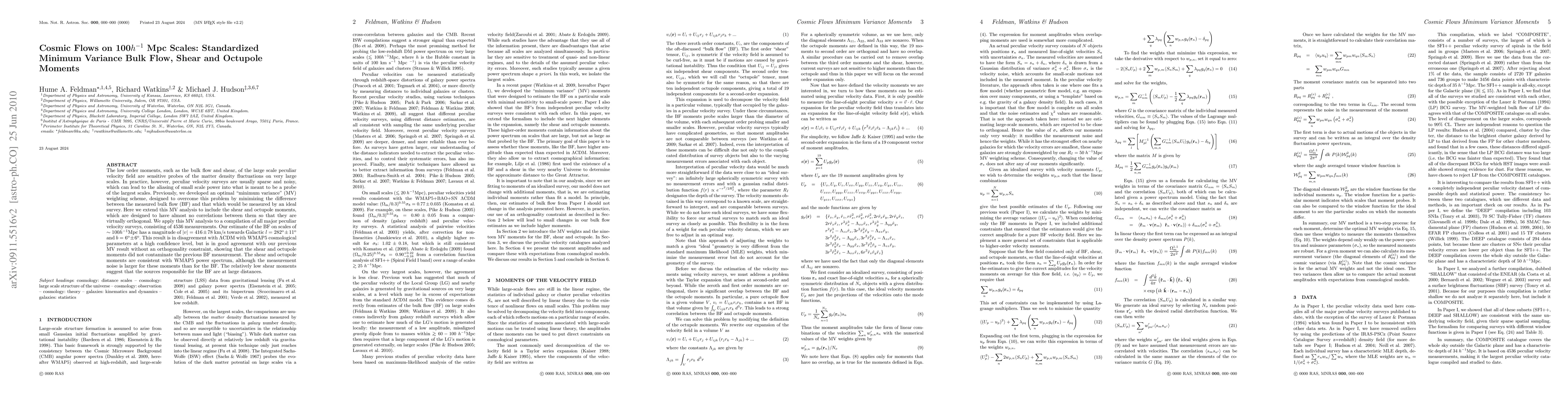 The low order moments, such as the bulk flow and shear, of the large scale peculiar velocity field are sensitive probes of the matter density fluctuations on very large scales. In practice, however, peculiar velocity surveys are usually sparse and noisy, which can lead to the aliasing of small scale power into what is meant to be a probe of the largest scales. Previously, we developed an optimal ``minimum variance'' (MV) weighting scheme, designed to overcome this problem by minimizing the difference between the measured bulk flow (BF) and that which would be measured by an ideal survey. Here we extend this MV analysis to include the shear and octupole moments, which are designed to have almost no correlations between them so that they are virtually orthogonal. We apply this MV analysis to a compilation of all major peculiar velocity surveys, consisting of 4536 measurements. Our estimate of the BF on scales of ~ 100 Mpc/h has a magnitude of |v|= 416 +/- 78 km/s towards Galactic l = 282 degree +/- 11 degree and b = 6 degree +/- 6 degree. This result is in disagreement with LCDM with WMAP5 cosmological parameters at a high confidence level, but is in good agreement with our previous MV result without an orthogonality constraint, showing that the shear and octupole moments did not contaminate the previous BF measurement. The shear and octupole moments are consistent with WMAP5 power spectrum, although the measurement noise is larger for these moments than for the BF. The relatively low shear moments suggest that the sources responsible for the BF are at large distances.