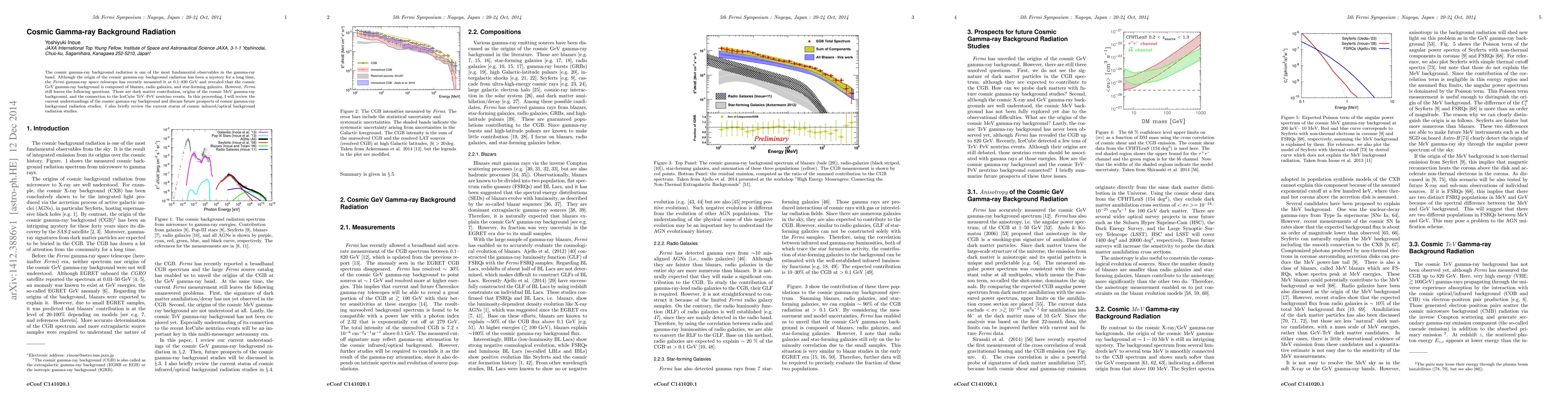 The cosmic gamma-ray background radiation is one of the most fundamental observables in the gamma-ray band. Although the origin of the cosmic gamma-ray background radiation has been a mystery for a long time, the Fermi gamma-ray space telescope has recently measured it at 0.1-820 GeV and revealed that the cosmic GeV gamma-ray background is composed of blazars, radio galaxies, and star-forming galaxies. However, Fermi still leaves the following questions. Those are dark matter contribution, origins of the cosmic MeV gamma-ray background, and the connection to the IceCube TeV-PeV neutrino events. In this proceeding, I will review the current understandings of the cosmic gamma-ray background and discuss future prospects of cosmic gamma-ray background radiation studies. I also briefly review the current status of cosmic infrared/optical background radiation studies.