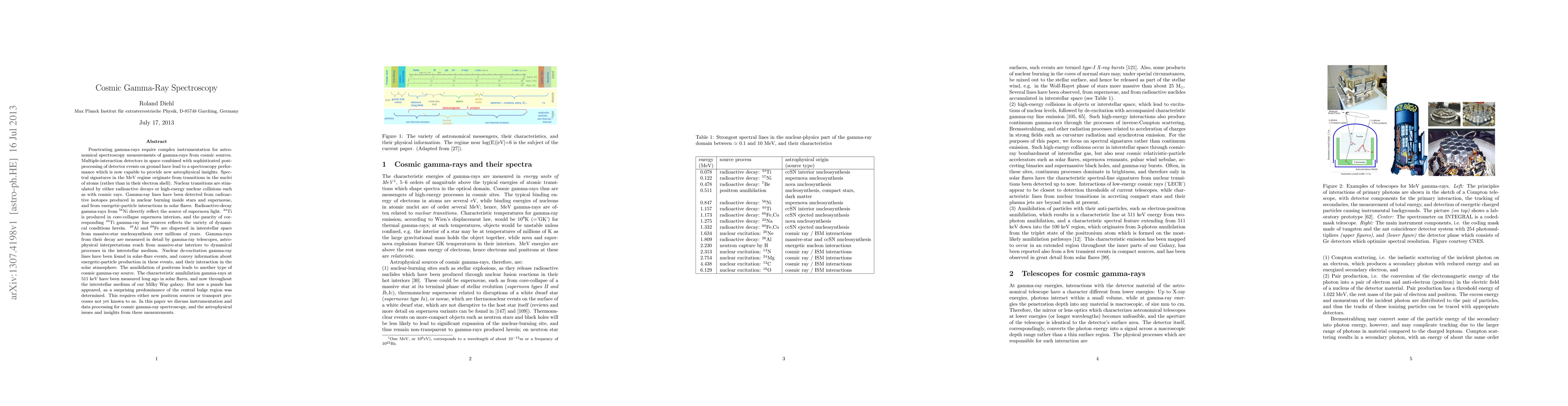This paper discusses the instrumentation and data processing for cosmic gamma-ray spectroscopy, focusing on nuclear transitions in the MeV regime. It highlights insights from gamma-ray lines related to supernovae, massive-star nucleosynthesis, and positron annihilation, while addressing the puzzle of the unexpected gamma-ray predominance in the Milky Way's central bulge.