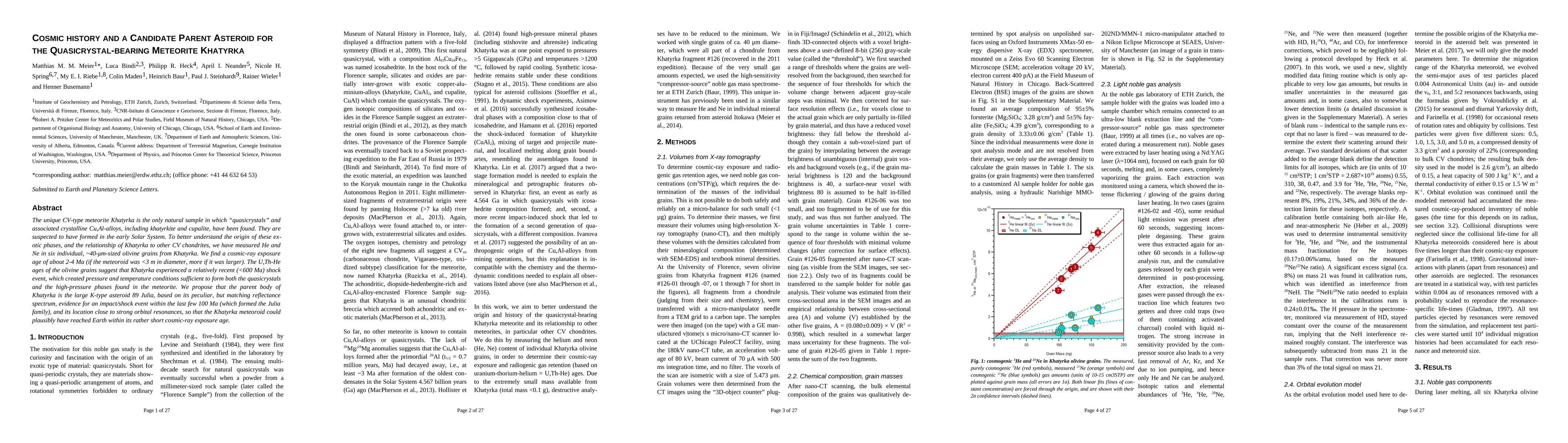 The Khatyrka meteorite, containing unique quasicrystals and Cu,Al-alloys, likely formed in the early Solar System. Analysis of He and Ne in olivine grains suggests a cosmic-ray exposure age of 2-4 Ma and a recent shock event <600 Ma, proposing the large K-type asteroid 89 Julia as its parent body.