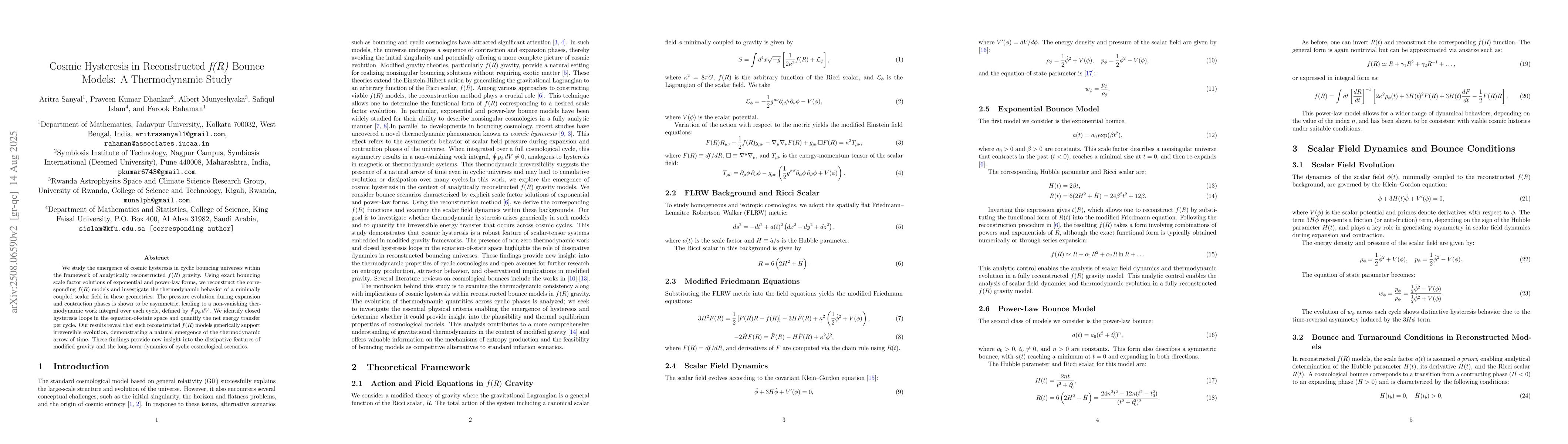We study the emergence of cosmic hysteresis in cyclic bouncing universes within the framework of analytically reconstructed $f(R)$ gravity. Using exact bouncing scale factor solutions of exponential and power-law forms, we reconstruct the corresponding $f(R)$ models and investigate the thermodynamic behavior of a minimally coupled scalar field in these geometries. The pressure evolution during expansion and contraction phases is shown to be asymmetric, leading to a non-vanishing thermodynamic work integral over each cycle, defined by $\oint p_\phi\, dV$. We identify closed hysteresis loops in the equation-of-state space and quantify the net energy transfer per cycle. Our results reveal that such reconstructed $f(R)$ models generically support irreversible evolution, demonstrating a natural emergence of the thermodynamic arrow of time. These findings provide new insight into the dissipative features of modified gravity and the long-term dynamics of cyclic cosmological scenarios.