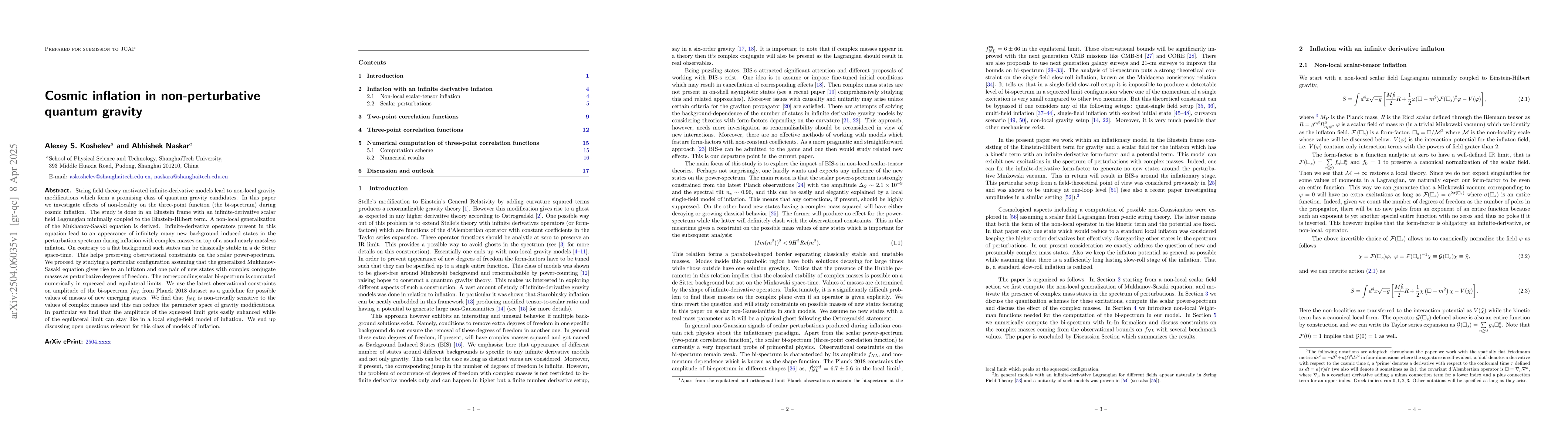 The paper presents a non-local generalization of the Mukhanov-Sasaki equation and computes the bi-spectrum in squeezed and equilateral limits, revealing the sensitivity of non-Gaussianity to complex masses in non-local quantum gravity models.