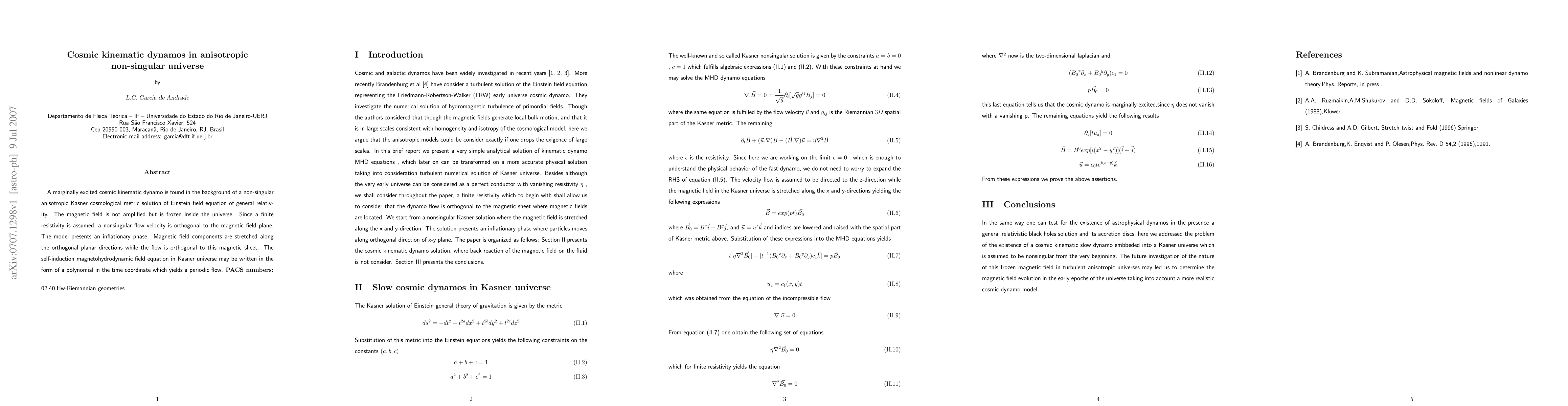 This paper explores a cosmic kinematic dynamo in a non-singular anisotropic Kasner universe, where magnetic fields are frozen within the universe but not amplified. The model features an inflationary phase and periodic flow due to self-induction, with flow orthogonal to the magnetic field plane.