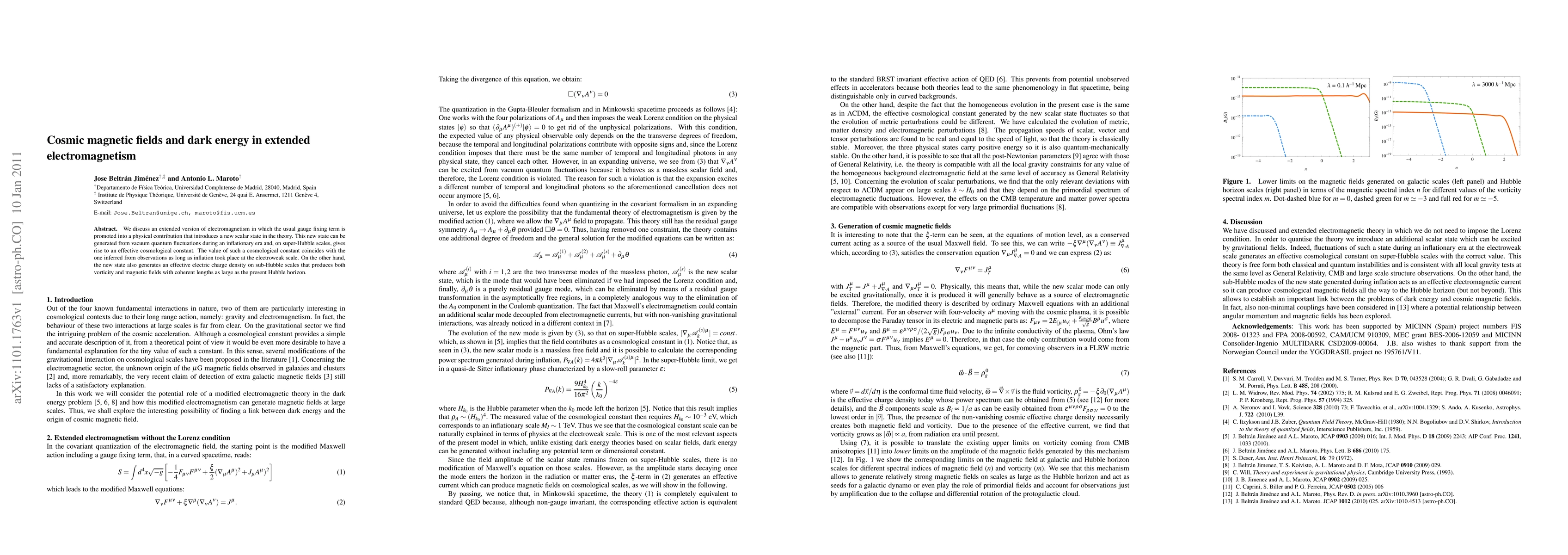 This paper proposes an extended electromagnetism model where a new scalar state emerges from gauge fixing, leading to a cosmological constant matching observations if inflation occurred at the electroweak scale. It also generates large-scale magnetic fields and vorticity from electric charge density.