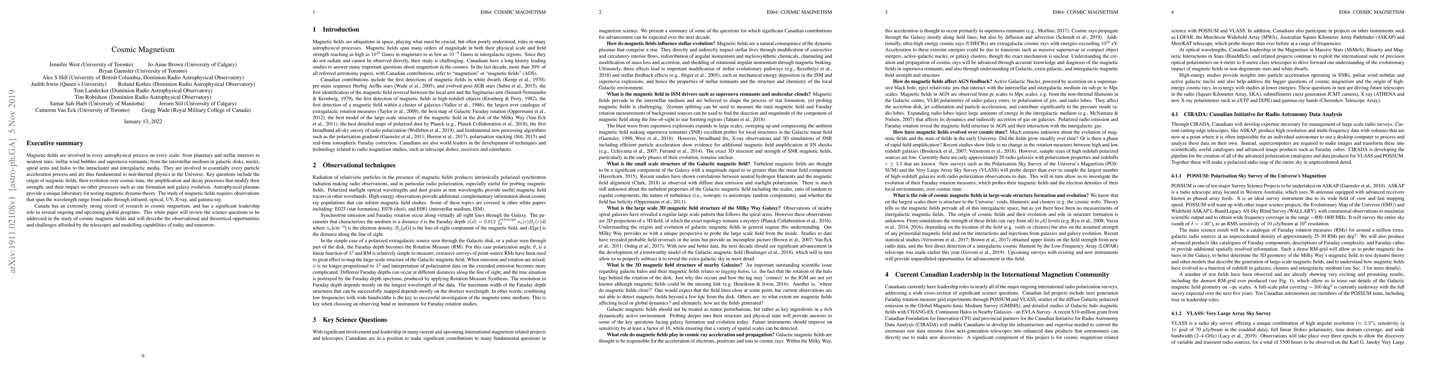 Magnetic fields are involved in every astrophysical process on every scale: from planetary and stellar interiors to neutron stars, stellar wind bubbles and supernova remnants; from the interstellar medium in galactic disks, nuclei, spiral arms and halos to the intracluster and intergalactic media. They are involved in essentially every particle acceleration process and are thus fundamental to non-thermal physics in the Universe. Key questions include the origin of magnetic fields, their evolution over cosmic time, the amplification and decay processes that modify their strength, and their impact on other processes such as star formation and galaxy evolution. Astrophysical plasmas provide a unique laboratory for testing magnetic dynamo theory. The study of magnetic fields requires observations that span the wavelength range from radio through infrared, optical, UV, X-ray, and gamma-ray. Canada has an extremely strong record of research in cosmic magnetism, and has a significant leadership role in several ongoing and upcoming global programs. This white paper will review the science questions to be addressed in the study of cosmic magnetic fields and will describe the observational and theoretical opportunities and challenges afforded by the telescopes and modelling capabilities of today and tomorrow.